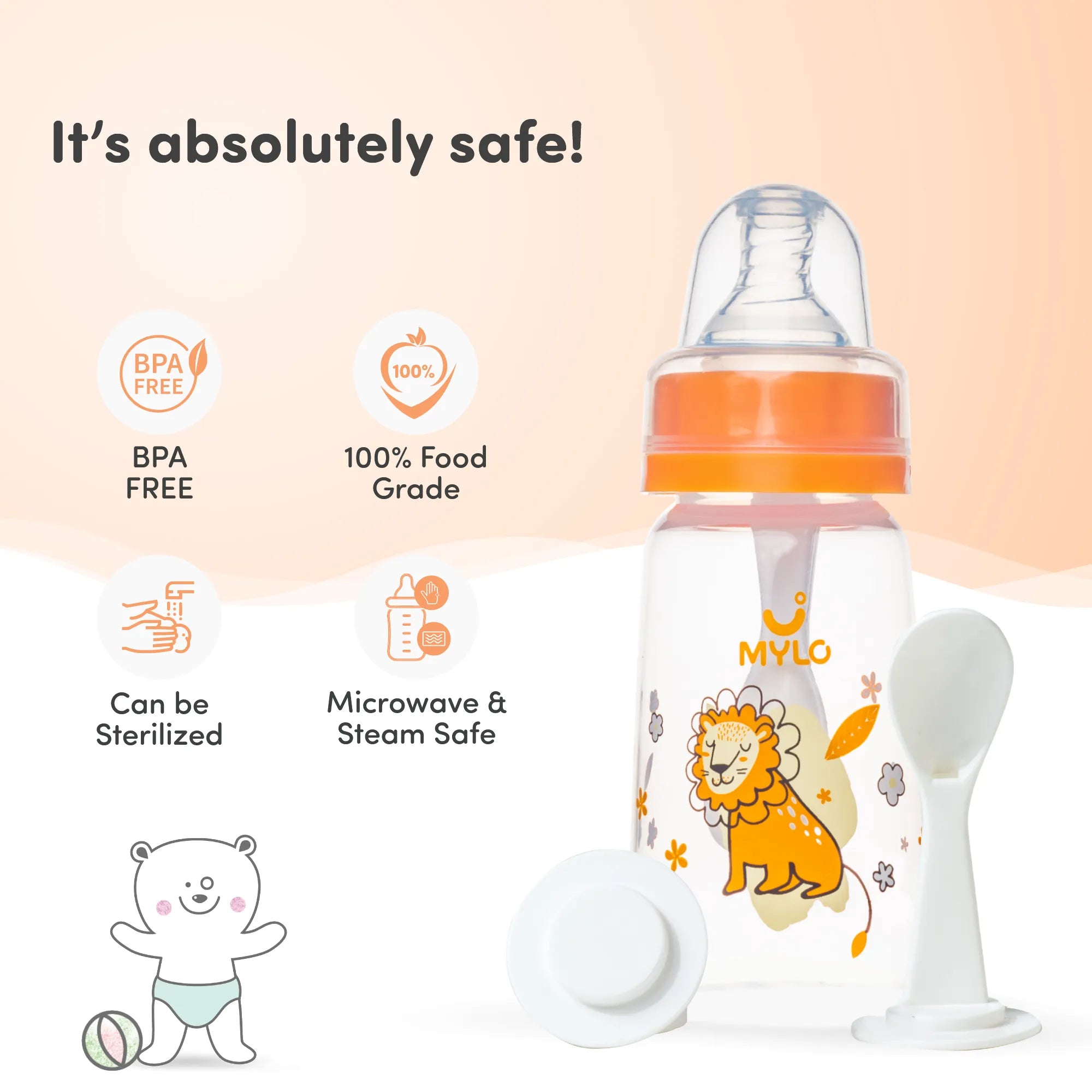 Colic is a common problem in newborn babies & infants. Introducing Feels Natural Baby Bottle- BPA Free with Anti-Colic Nipple which is made using the highest quality food-grade materials and is 100% BPA Free. The equipment used is from Germany & Japan. The technology used to manufacture this bottle is thoroughly controlled and conforms to the highest level of precision while ensuring absolute quality and hygiene at every step of the process. What makes it all the more special is that the tiny air vents on the rim of the Anti-colic nipple permit air to flow into the bottle, preventing it from going into the infant’s tummy, minimizing colic, uneasiness, and hiccups. The cute animal character design ensures that there is never a dull moment for you and your munchkin! The bottle comes with a spoon which can be used later while introducing solids to the baby.