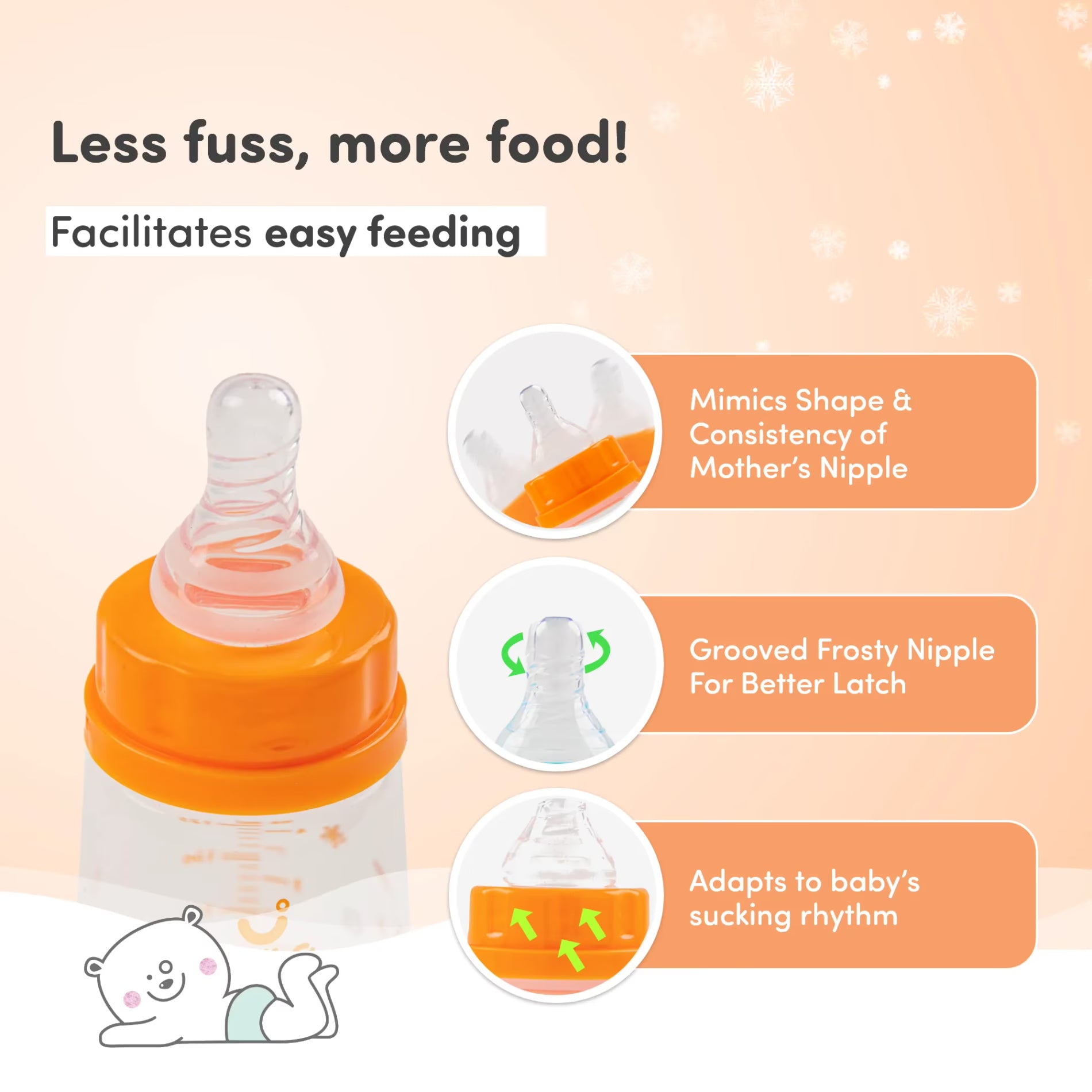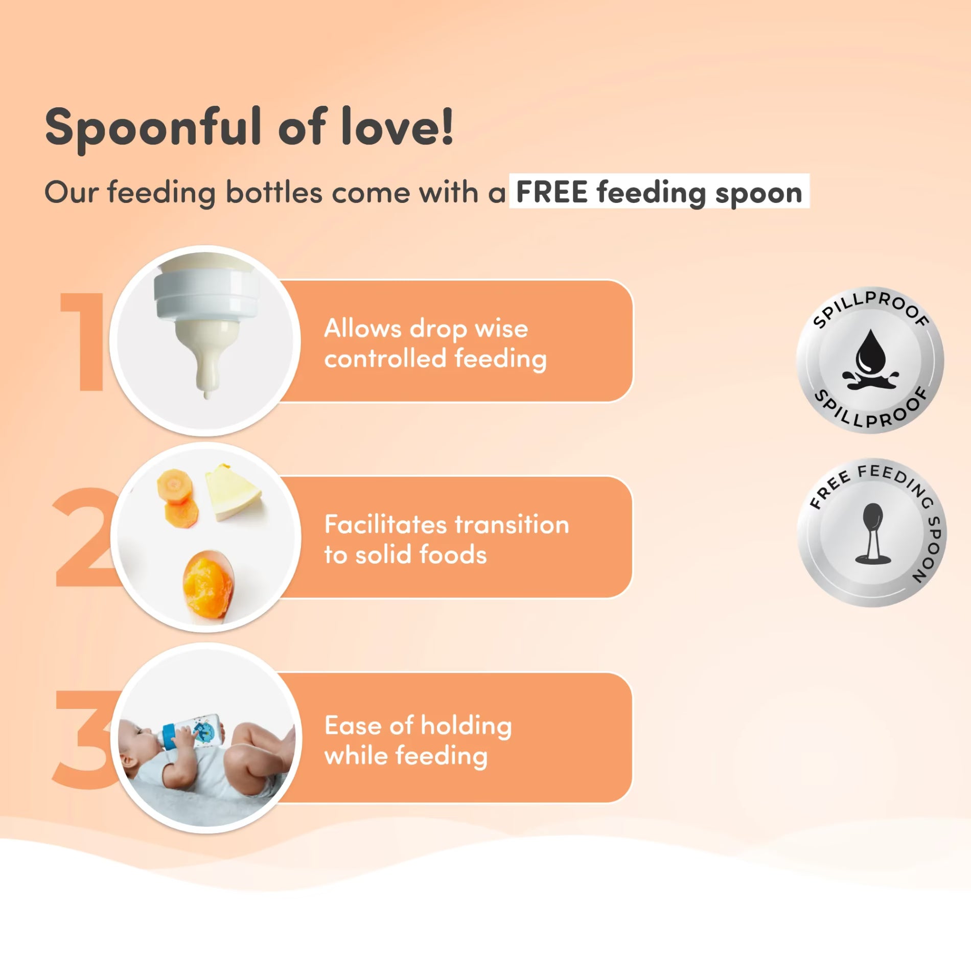 Colic is a common problem in newborn babies & infants. Introducing Feels Natural Baby Bottle- BPA Free with Anti-Colic Nipple which is made using the highest quality food-grade materials and is 100% BPA Free. The equipment used is from Germany & Japan. The technology used to manufacture this bottle is thoroughly controlled and conforms to the highest level of precision while ensuring absolute quality and hygiene at every step of the process. What makes it all the more special is that the tiny air vents on the rim of the Anti-colic nipple permit air to flow into the bottle, preventing it from going into the infant’s tummy, minimizing colic, uneasiness, and hiccups. The cute animal character design ensures that there is never a dull moment for you and your munchkin! The bottle comes with a spoon which can be used later while introducing solids to the baby.