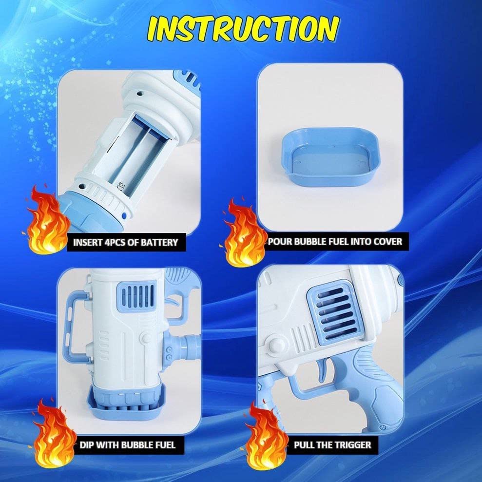 • You only need to install four AA batteries (not included), just pour the bubble water on the spare board, immerse the muzzle of the bubble gun in the bubble water, and then press the switch to enjoy the bubble time.