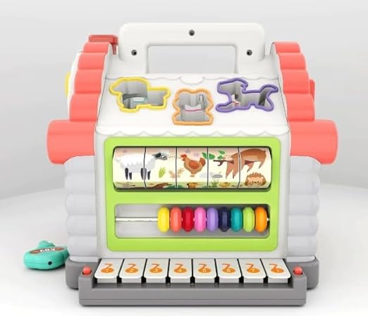 • 5 pieces of geometrical shape blocks, 6 pieces of animal blocks with animal sounds, musical playing, opening door game, piano keys, counting center, flashing light help kids develop cognitive skills.