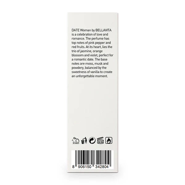 DATE Woman by Bella Vita Luxury is a celebration of love and romance. The perfume has top notes of Pink Pepper and Red Fruits. At its heart, lies the trio of Jasmine, Orange Blossom and Violet, perfect for a romantic date. The base notes are Moss, Musk and Powdery, balanced by the sweetness of Vanilla to create an unforgettable moment.