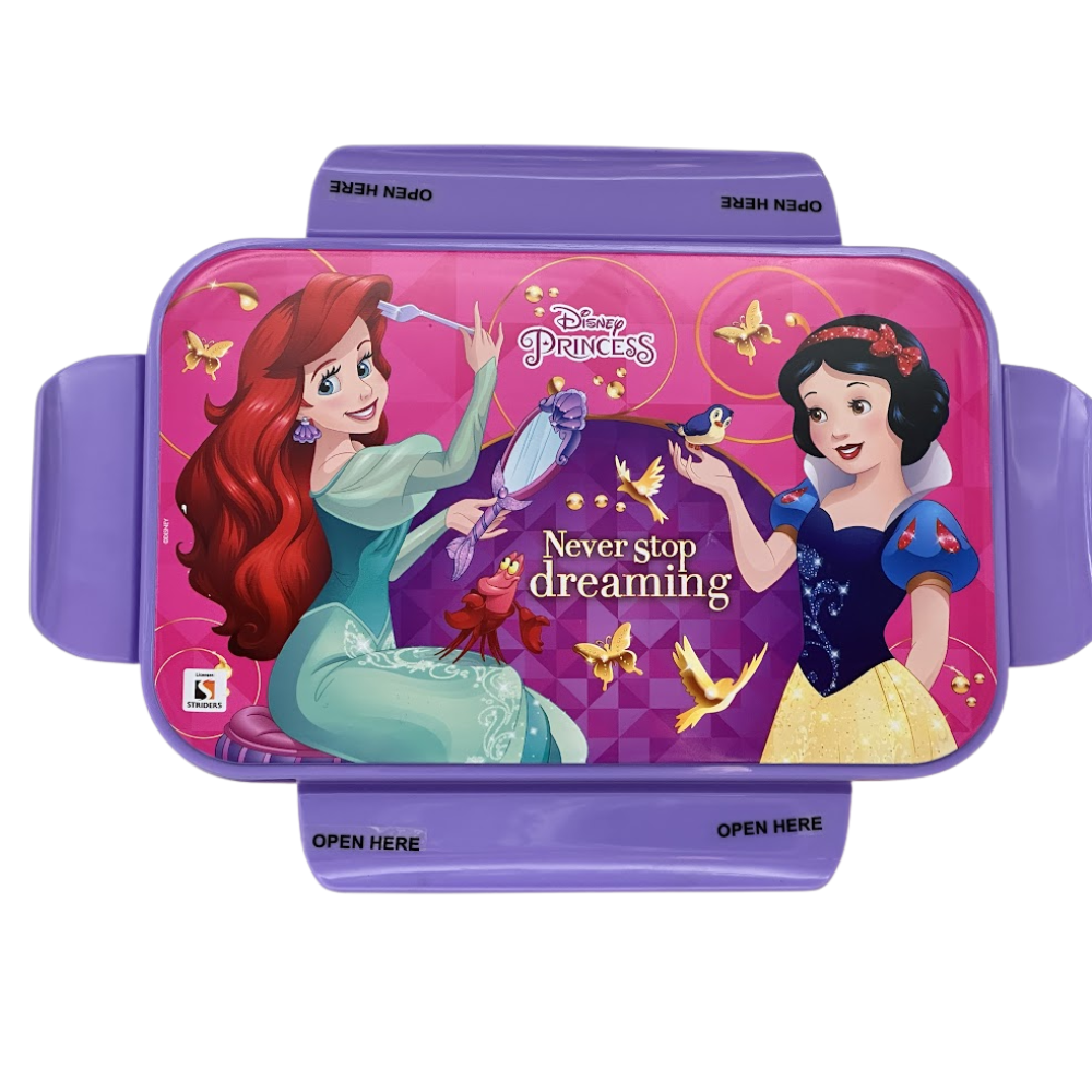 Striders Disney Princess Kids Lunch Box | “Never Stop Dreaming” Princess Design | Durable Plastic Tiffin Box with Easy Open Side Locks