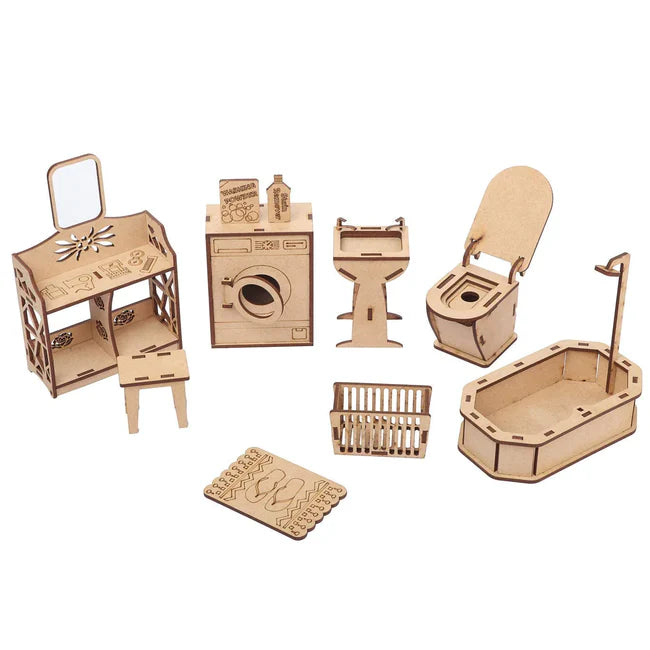 Most children dream of a doll house of their own. Beautiful DIY Dream Bathroom Doll House especially designed with build & paint feature for young kids. This Doll House is Furnished with bathtub, washing machine, commode , washbasin, clothbin , floor mat, cloth stand with stool & beautiful graphics mirror, window, curtain with rod etc. Complete Family Entertainment game simply pull the pieces from the pine wood sheet and assemble it all together and paint it with a given color kit by your own choice. Develop Educational skills such as logical thinking, problem solving, creativity, and, of course, fine motor skills. Educational games can be fun. That’s why Construction kit is one of the best gifts for your kid's birthday and other occasions. Suitable for boys and girls 8+ Dollhouse size - 30x30x20 cm.