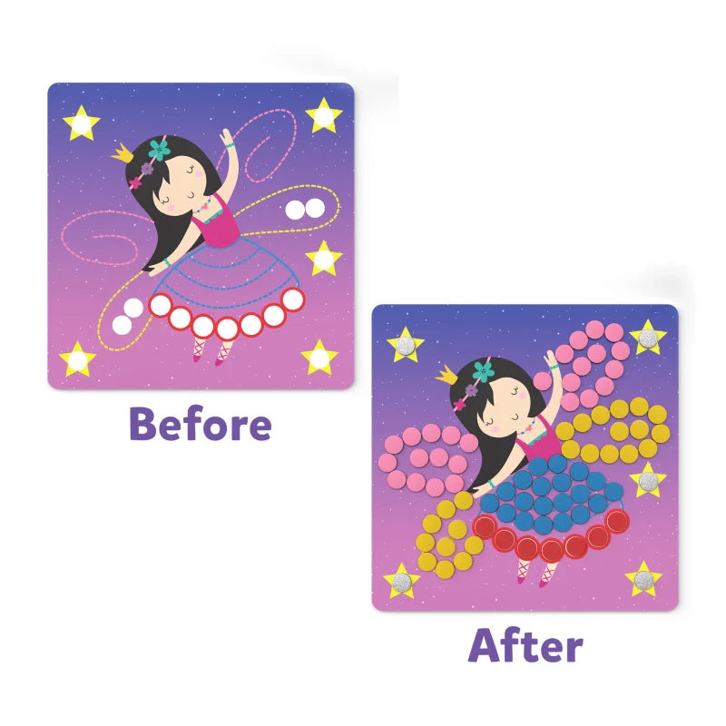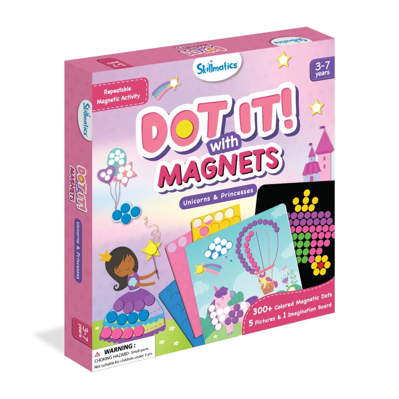 With over 300+ magnetic dots, your child will use their fine motor skills and imagination to complete 5 magical unicorn and princess-themed pictures! This set also includes a blank board and an inspiration guide to encourage your child to create their own pictures from scratch!