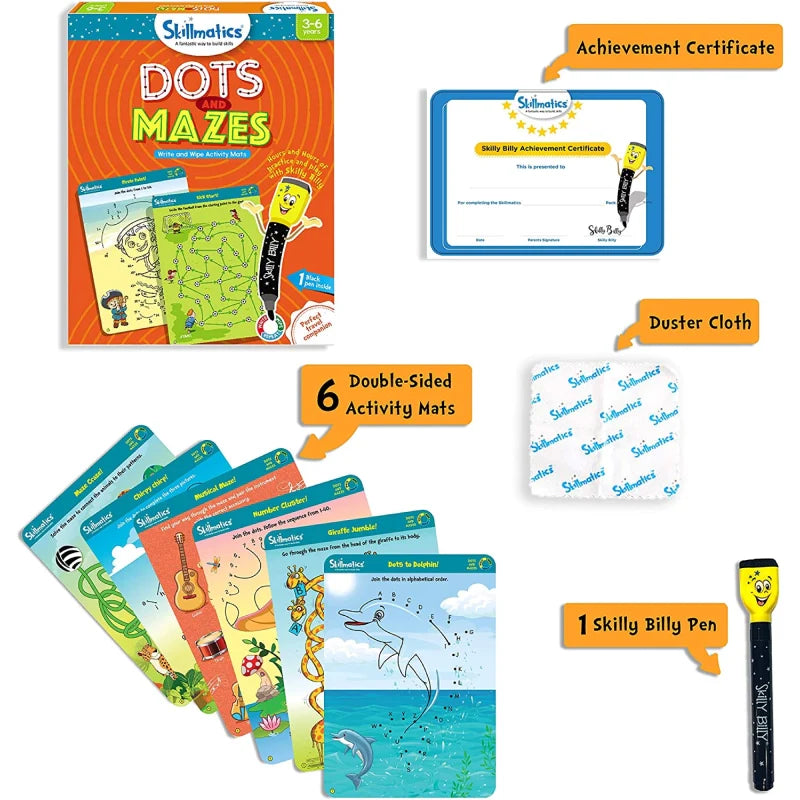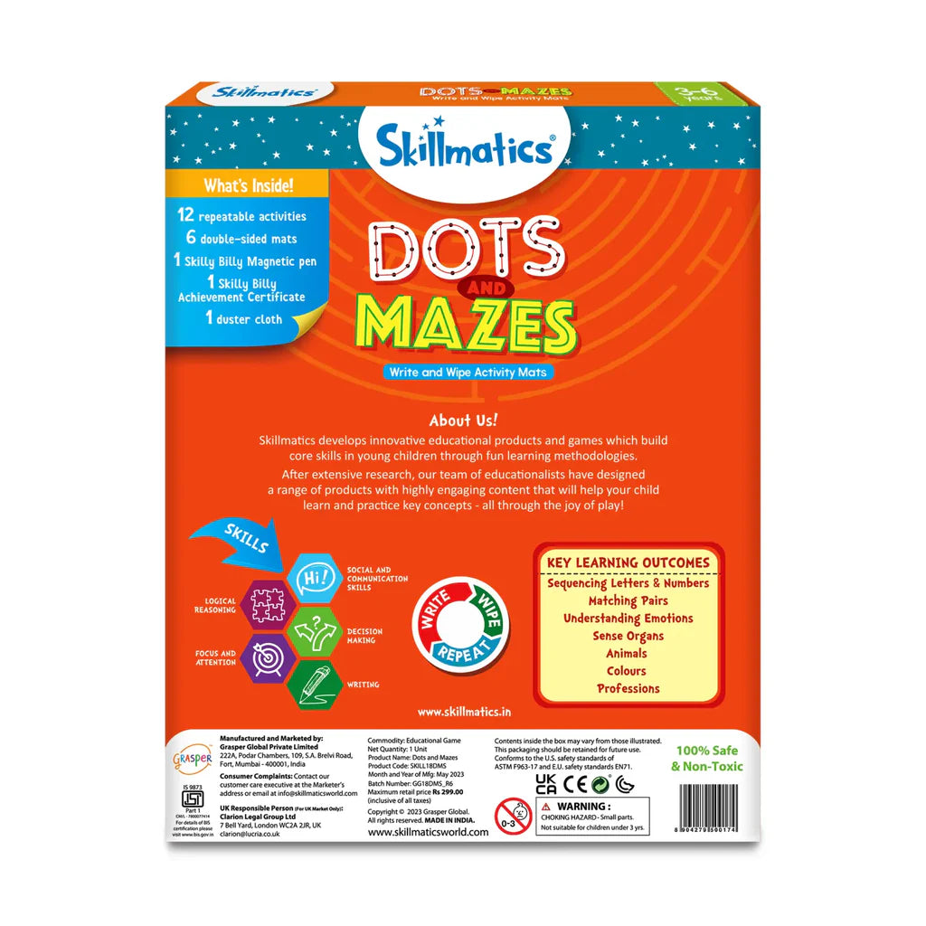 Skillmatics Dots and Mazes is the perfect product to build visual tracking, fine motor and problem-solving skills in the early years. These time-tested formats help build foundational learning skills while ensuring your child has hours and hours of fun! With 12 repeatable activities, this product is a great travel companion to engage your child while on the go!