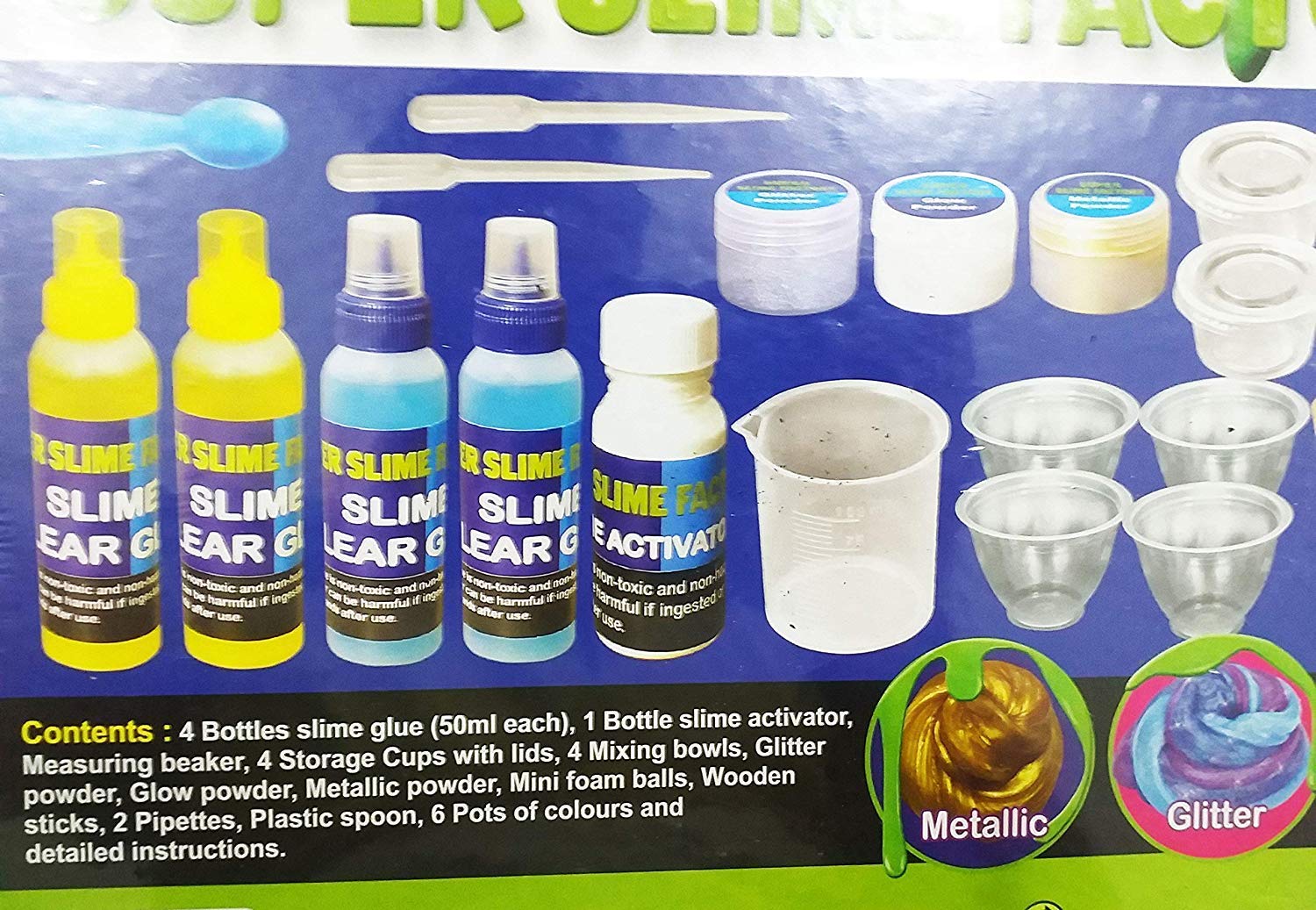 • The package include: 4 bottles slime glue (50 ml each), 1 bottle slime activator, measuring beaker, 4 storage cups with lids, 4 mixing bowls, glitter powder, glow powder, metallic powder, mini foam balls, wooden sticks, 2 pipettes, plastic spoon, pots of colors and detailed instructions.