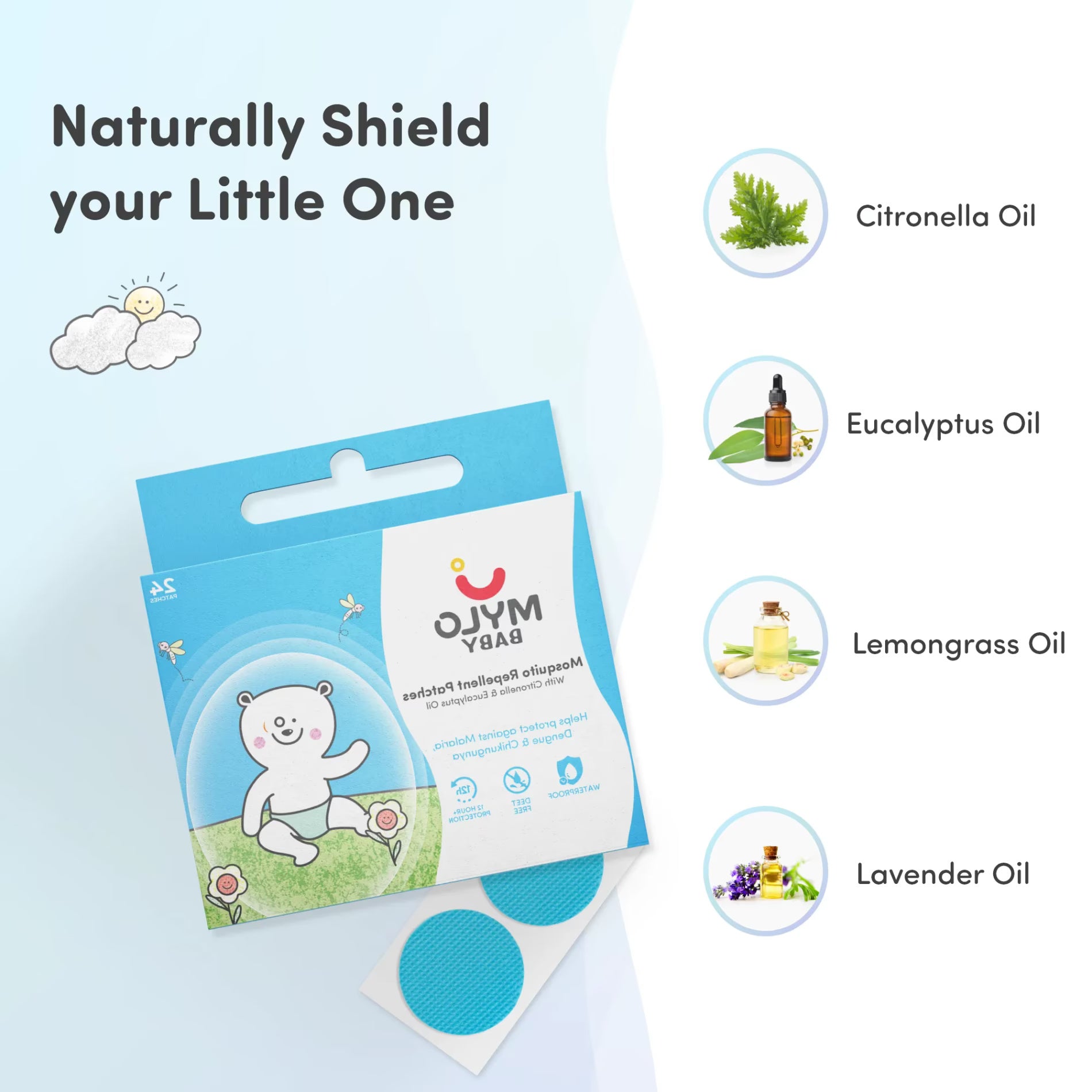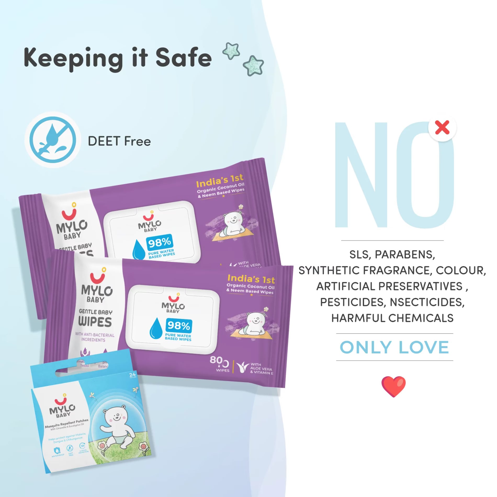 Babies are delicate & their skin requires protection against bacteria and harmful mosquito bites. Mylo has put together India’s first baby wet wipes with organic coconut oil & organic aloe vera and 100% Natural Mosquito Repellent Patches to clean your baby after a mess and to keep mosquitoes at bay. Our alcohol-free baby wipes can be used for face cleaning, removing make-up, and cleaning the baby’s skin. These water-based baby wipes are completely safe to use for newborns and infants. Our Mosquito Repellent Patches are made with ingredients such as natural citronella oil, eucalyptus oil, lemongrass oil & lavender oil & are the perfect way to ensure that your baby plays and sleeps peacefully, without making you worry about mosquito bites.