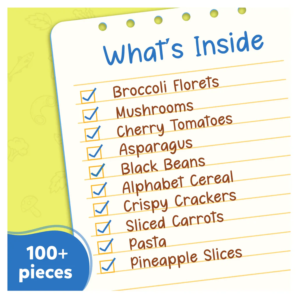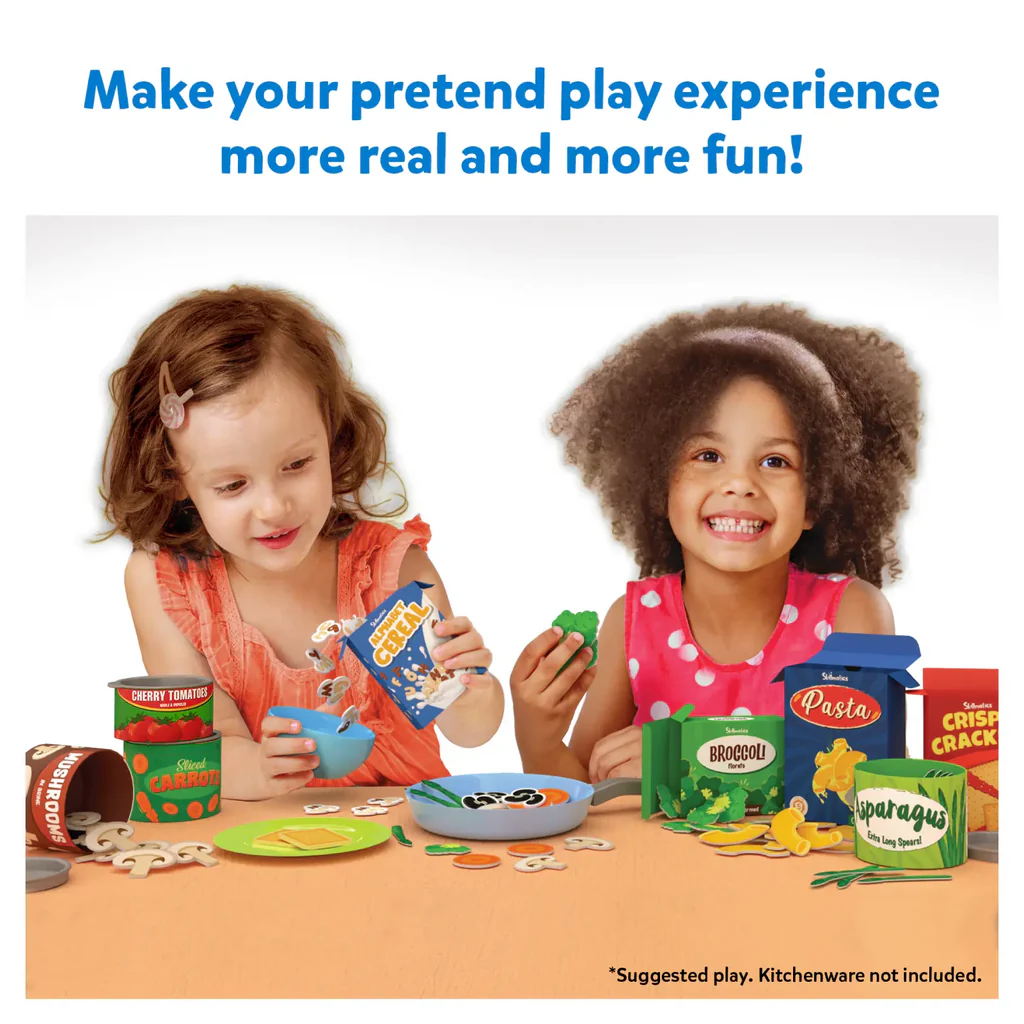 GROCERY SET WITH PLAY FOOD INSIDE! - The Skillmatics Grocery Set comes with 10 containers of 100+ pieces of sturdy play food made of thick paper board. We included broccoli florets, mushrooms, sardines, asparagus, black beans, alphabet cereal, crispy crackers, sliced carrots, pasta, and pineapple slices.