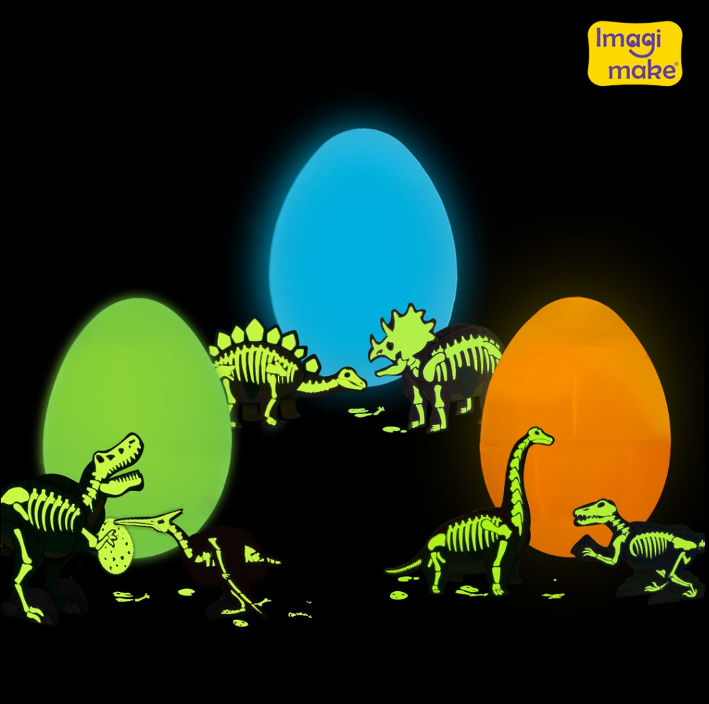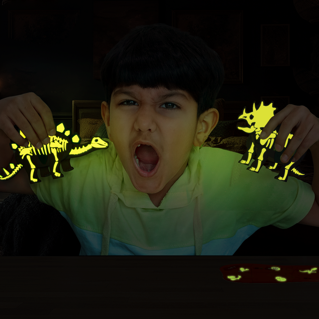 Experience the thrill of the Jurassic era with Glow in the Dark Dinos & Egg, featuring two iconic dinosaurs: the mighty Stegosaurus and the majestic Triceratops, sparking your child's imagination and curiosity. Glow in the dark egg and dinosaur adds to the magical experience of this toy. Along with the Entire Egg, the dinosaur skeleton also glows up in the dark, giving a fossiled look to the Dinosaur 3D Models. The puzzle mat includes glowing elements as well for an added layer of excitement.