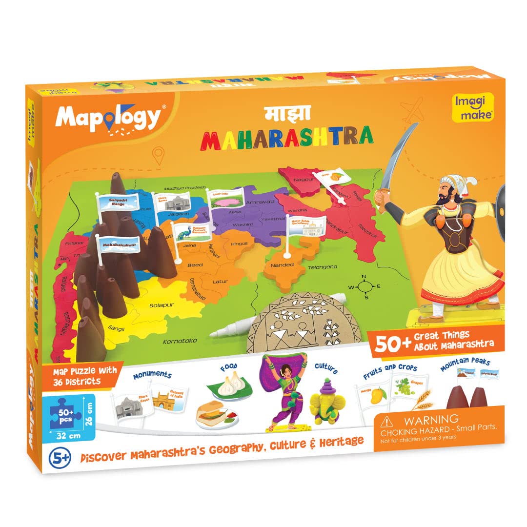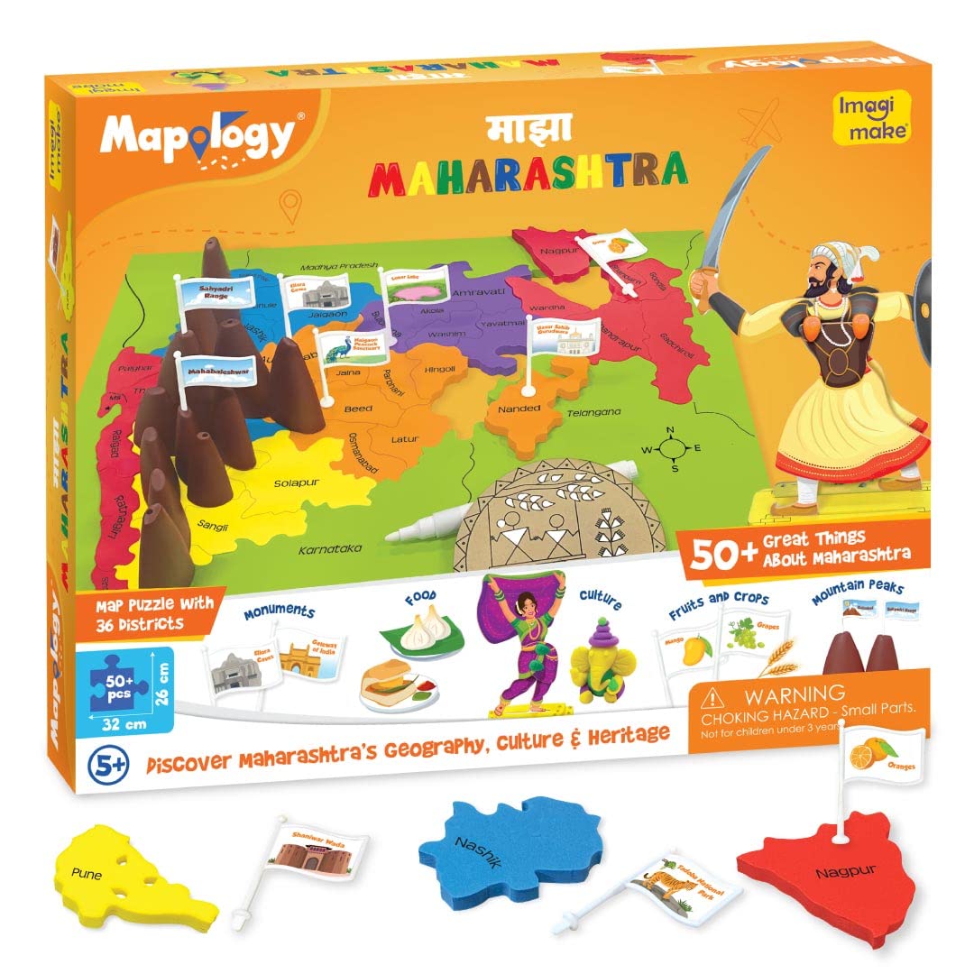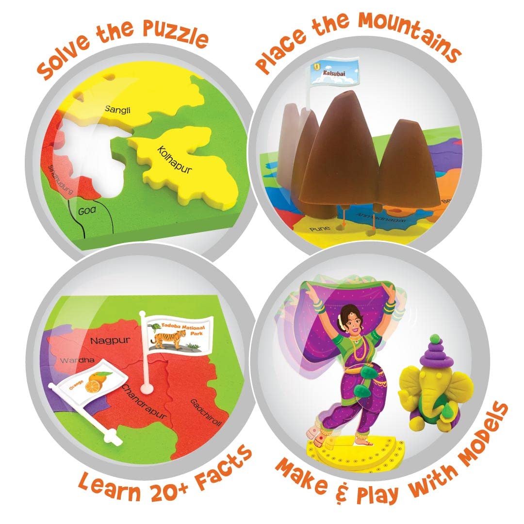 This Maharashtra Map puzzle and activity set allows children to learn as they play and appreciate the geography, heritage, culture and a lot more. Educational toys for kids 5+ years - Each puzzle piece is shaped like the district with an actual-sized mat to help children solve the puzzle. From the tallest peak of Salher to the longest river of the state, from the delicious Ratnagiri Alphonso to the tiger in the Tadoba National park - this product has a treasure trove of facts about Maharashtra