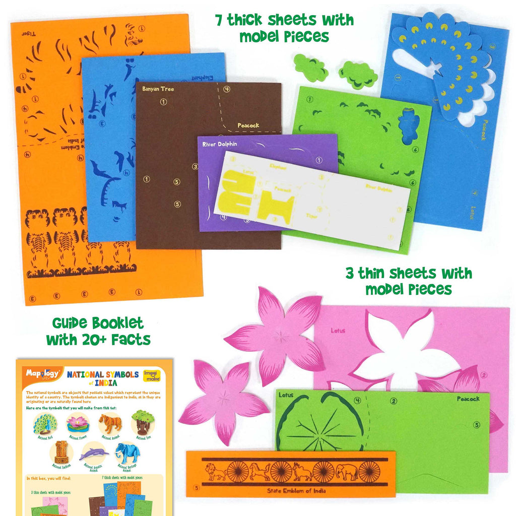 The national symbols are objects that possess values which represent the unique identity of the country. Let kids explore the symbols of national identity by making their own miniature models as like National Animal - Tiger, Naitonal Bird - Peacock, Naitonal Tree - Banyan Tree, National Flower - Lotus, National Heritage Animal - Elephant, National Aquatic Animal - River Dolphin and the National Emblem in this construction set. Kids can also learn 20+ Interesting facts through guide booklet like the Ganges River Dolphin was made a national symbol to save it from extinction and the National Emblem is a representative seal of the republic of India and many more such amazing and interesting facts