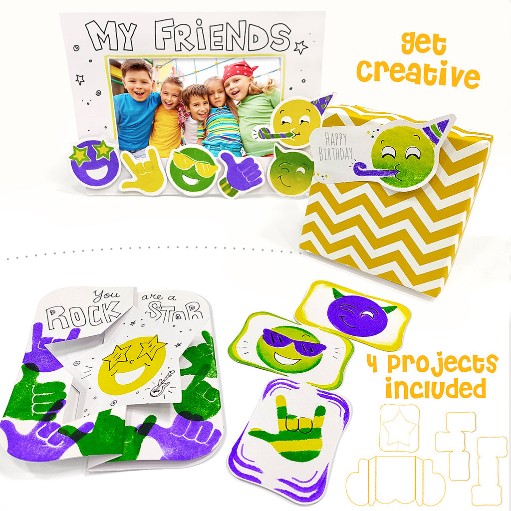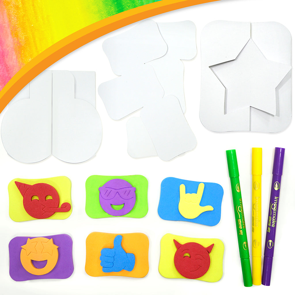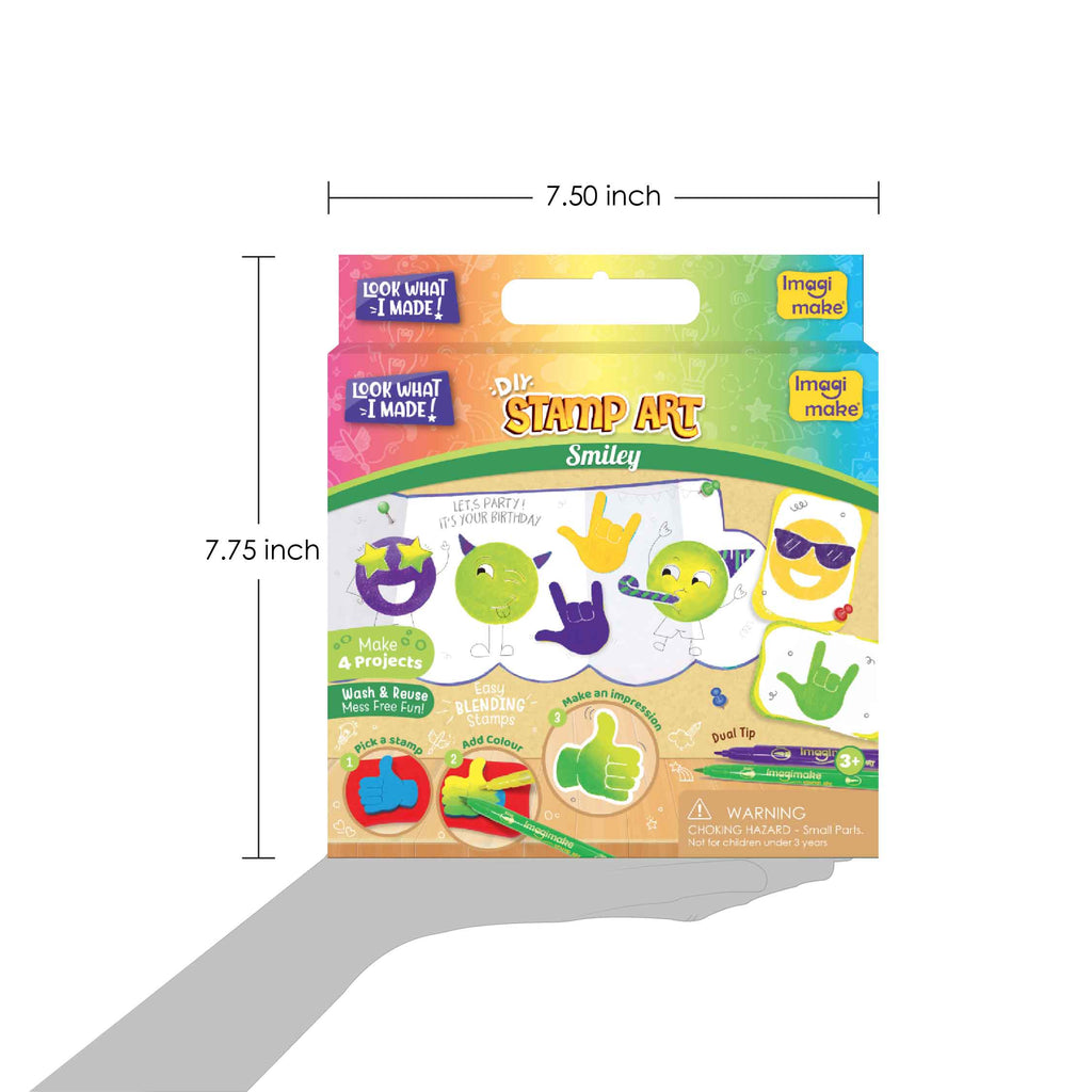 Just Colour, Stamp, Create! Choose from a wide variety of cool designs of Stamps with our easy blending Stamp pens. This Kit contains 6 reusable Smiley Theme Stamps, 3 Stamp pens and 4 projects