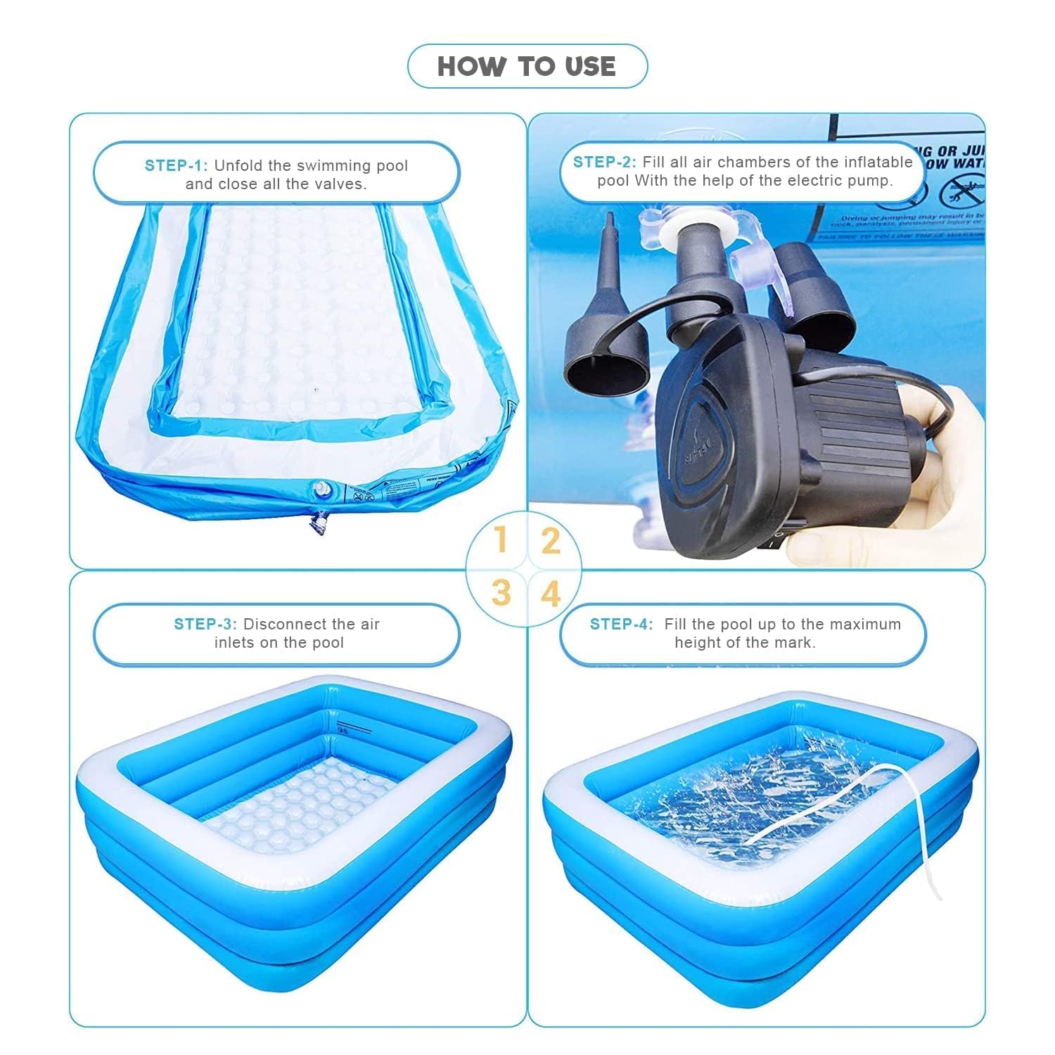 Turn your home into a mini water park for kids and family fun with this large inflatable swimming pool with electric pump. Designed with 3 durable air chambers for extra stability, this pool is perfect for kids, toddlers, and adults to enjoy refreshing summer play.