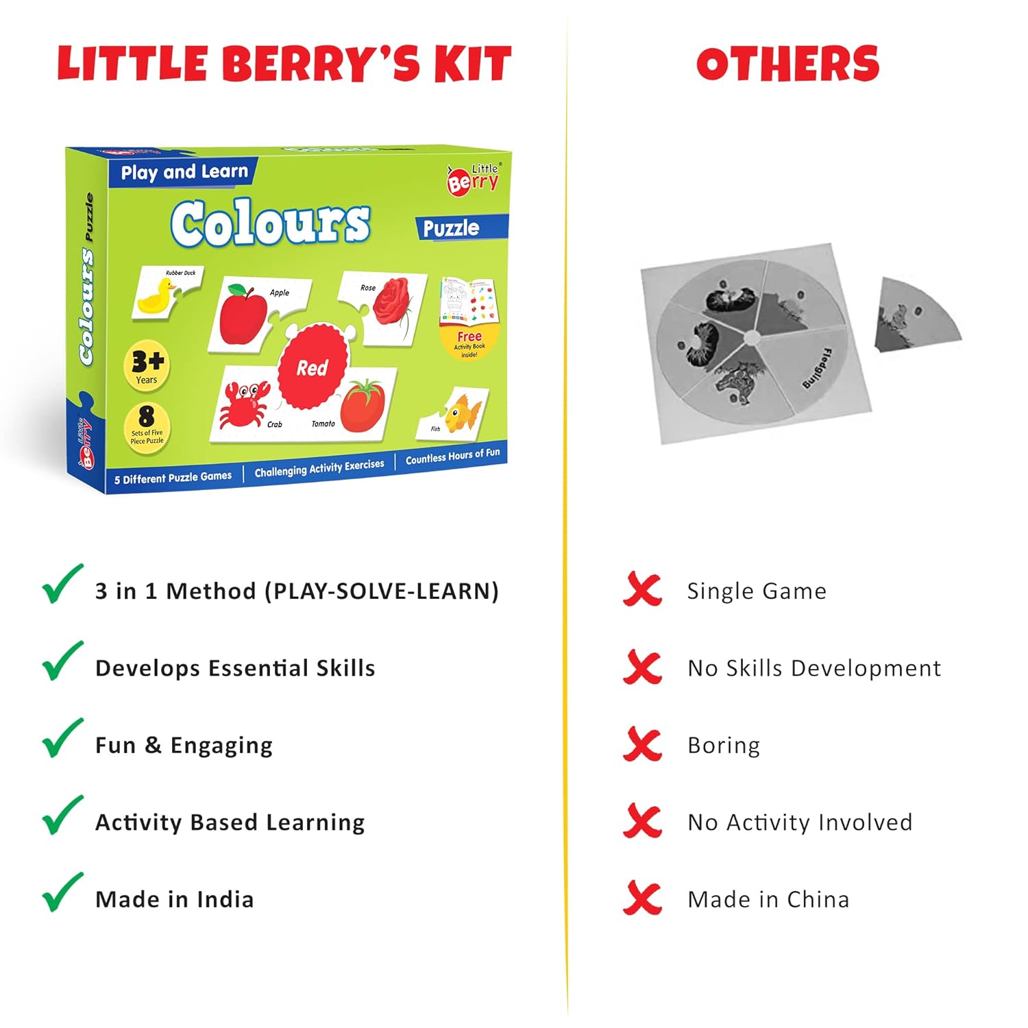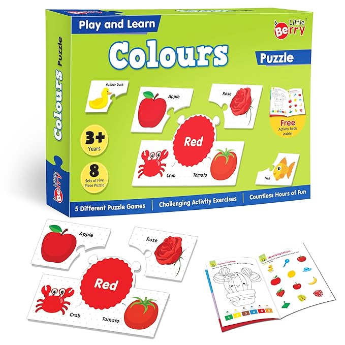 • 100% SAFE, CERTIFIED AND HIGH QUALITY PRODUCTS: This Play and Learn Colours Puzzle complies with all safety standards and is made of durable material: Puzzle is made of 1.8mm thick cardboard material and the activity book is made of high quality paper. Plus, all Little Berry products are lab tested and BIS certified.