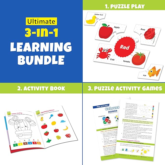 • 3-in-1 SET TO LEARN ABOUT COLOURS: Combine the puzzle, activity book and puzzle games in one to help your child learn everything about Colours. It's a complete educational toy to develop your toddler's intellectual ability and learn important first topics through fun educational activities. Your child won't even realize they're learning!