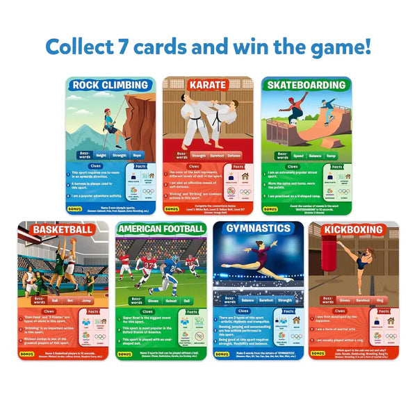 Bring home the most exciting game of questions! Ask up to 10 questions to guess the sport on the Game Card! Is it played in teams? Is it an outdoor sport? Is it an Olympic sport? Think hard, ask intelligent questions, use your clue cards wisely, and the be the first player to win 7 Game Cards