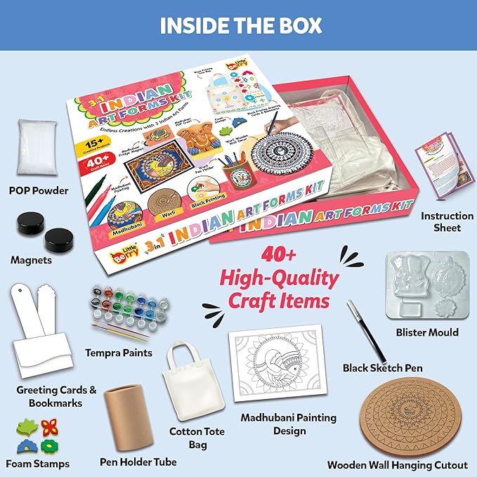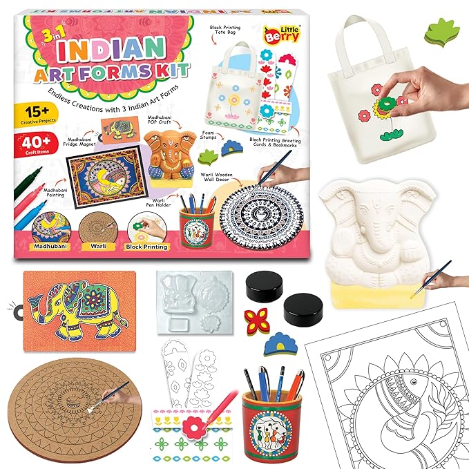 Little Berry Indian Art Forms Kits – 3 in 1c | Learn Warli & Block Printing | DIY Art & Craft Kits with Drawing Kit & Colour Set for Kids 6-12 | Educational Gift for Girls & Boys
