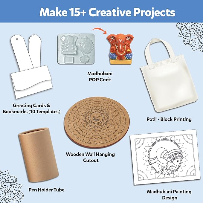 • 𝐀𝐥𝐥-𝐢𝐧-𝐎𝐧𝐞 𝐃𝐈𝐘 𝐀𝐫𝐭 & 𝐂𝐫𝐚𝐟𝐭 𝐒𝐞𝐭 : Packed with art & craft kits essentials, this set includes mandala patterns, drawing kit for kids, and painting kit for kids supplies to create beautiful Madhubani, Warli, and block prints.