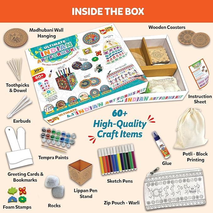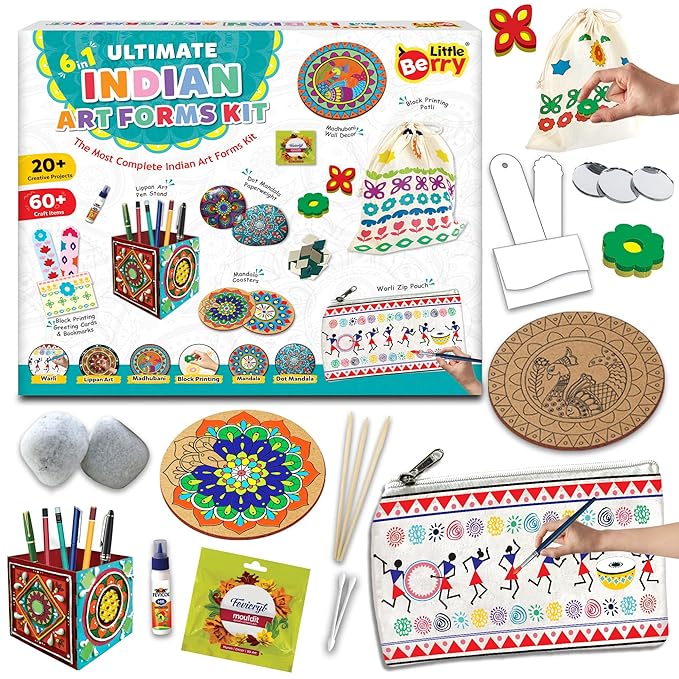 Explore Six Traditional Art Styles The Little Berry Ultimate Indian Art Forms Kit brings together six unique traditions—Madhubani, Warli, Lippan, Block Printing, Mandala, and Dot Mandala. Our mandala art kit for girls 12-15 with activities like Potli Bag Printing, Wooden Wall Décor, Coasters, and Rock Painting, this mandala art kit for kids and madhubani art kit provides a fun way for children and adults to explore Indian culture. All-in-One Creative Kit Equipped with over 60 items, the kit includes 1 Zip Pouch, 1 Potli, 1 Wooden Wall Décor Template, 2 Rocks, 2 Coasters, 1 Wooden Pen Stand, 10+ Greeting Card & Bookmark Templates, 12 Paints, 6 Stamps, Mirrors, Clay, Fevicol, 12 Sketchpens, Dot Mandala Tools, and instructions. Ideal for art kits for kids 9-12 or those exploring a madala art kit, it ensures every project has all supplies included. Engaging Projects for Skill Development With more than 20 projects, this set acts as both art supplies for adults and a indian art forms introduction for kids. From Madhubani wall pieces to Mandala coasters, each project enhances focus and creativity. The madhubani paintings kit inspires cultural learning while the variety of crafts adds excitement. Meaningful Gift for All Ages Suitable for kids, teens, and adults, this set works as an art kit for boys 12-15 or an art painting kit for families. It doubles as a diy painting kit, kalamkari art kit, or mandala art kit for adults with colors. A versatile madhubani kit and diy art and craft kit for kids, it’s also an art and craft materials kit for girls. Whether chosen as an art & craft kit for girls age 10 to 12 years, art kit for kids 6-12 girls, or a creativity kit, it fits every occasion. Also ideal as an indian art kit or a diy madhubani kit, making it a thoughtful gift that nurtures creativit