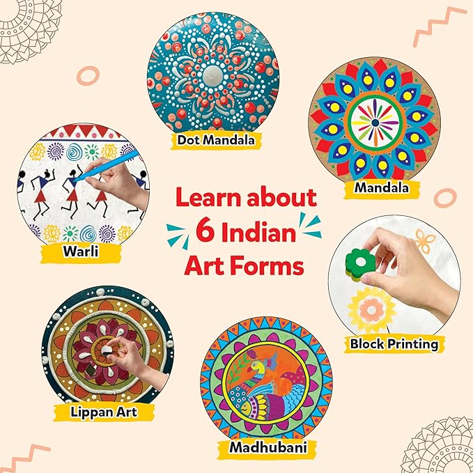 • 𝐂𝐨𝐦𝐩𝐫𝐞𝐡𝐞𝐧𝐬𝐢𝐯𝐞 𝟔-𝐢𝐧-𝟏 𝐀𝐫𝐭 𝐊𝐢𝐭: Explore six traditional Indian art styles in one set. This art kit and madhubani painting kit includes Madhubani, Warli, Block Printing, Mandala, Dot Mandala, and Lippan Art, helping kids and adults discover India’s artistic heritage.