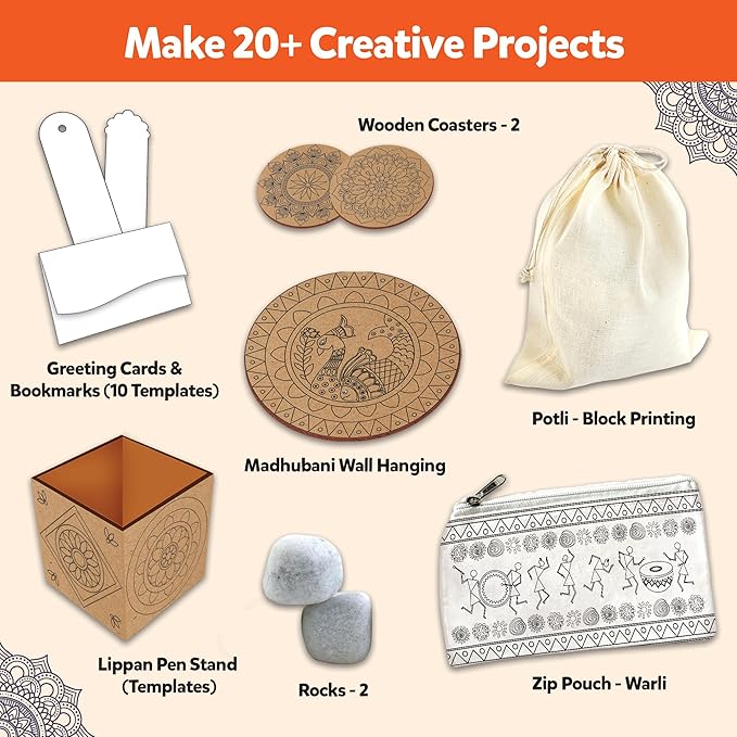 • 𝐒𝐮𝐩𝐩𝐨𝐫𝐭𝐬 𝐌𝐮𝐥𝐭𝐢𝐩𝐥𝐞 𝐏𝐫𝐨𝐣𝐞𝐜𝐭𝐬: With 20+ activities, users can create bookmarks, greeting cards, Madhubani Wooden Wall Décor, and Mandala Coasters. Suitable as indian art forms kits or a madhubani art kit for adults, the variety ensures hours of fun with clear instructions.