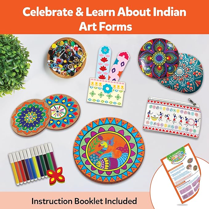 • 𝐄𝐧𝐜𝐨𝐮𝐫𝐚𝐠𝐞𝐬 𝐂𝐫𝐞𝐚𝐭𝐢𝐯𝐞 𝐋𝐞𝐚𝐫𝐧𝐢𝐧𝐠: Designed for structured projects like a Warli Zip Pouch or Dot Mandala Rock Painting, this set works as a mandala art kit and art kits for adults. Each activity introduces cultural patterns, helping users improve focus and creativity.