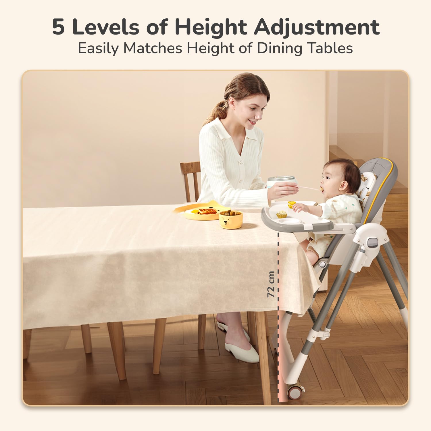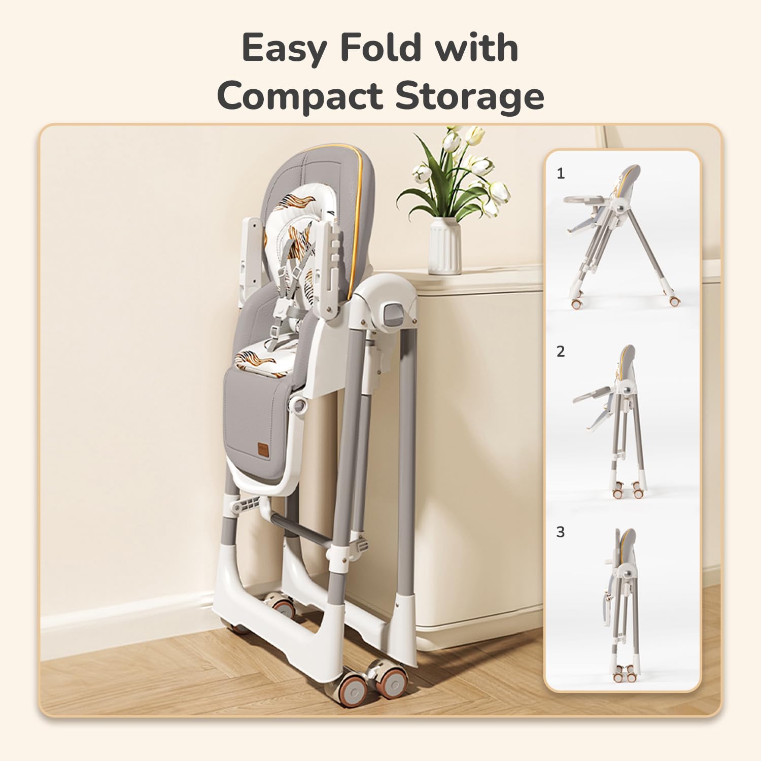• Reclinable Backrest and Footrest with PU Cushion: The plush PU cushion and adjustable backrest and footrest ensure your baby is always comfortable, whether they're eating, playing or napping.