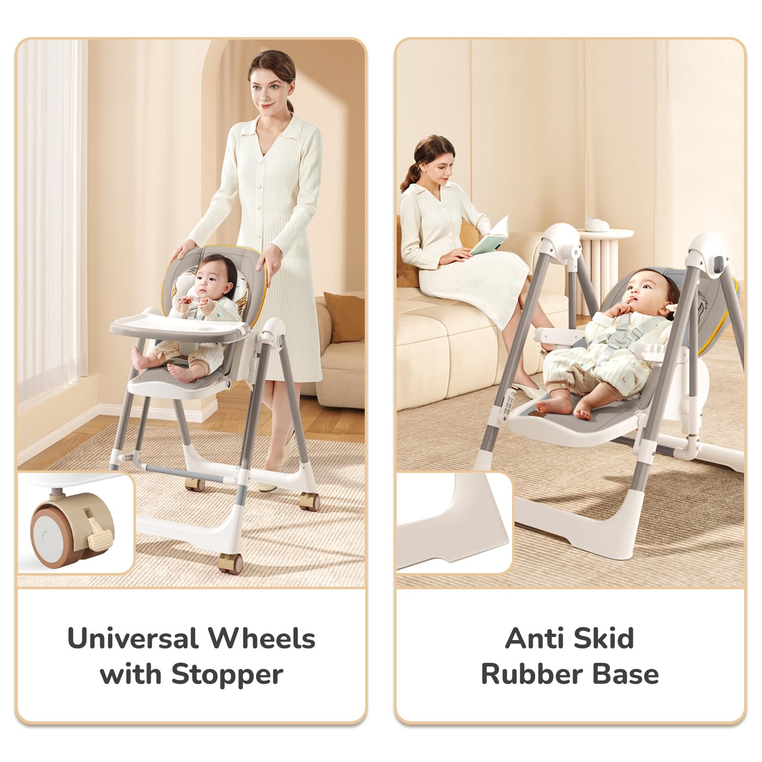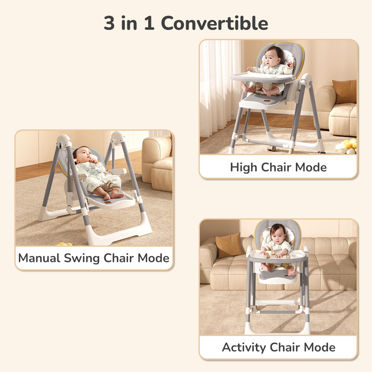 • 3-in-1 Multipurpose High Chair with Swing: Effortlessly transform from highchair into a swing and an activity chair, providing your baby with versatile seating options that grow with them.