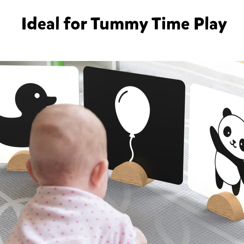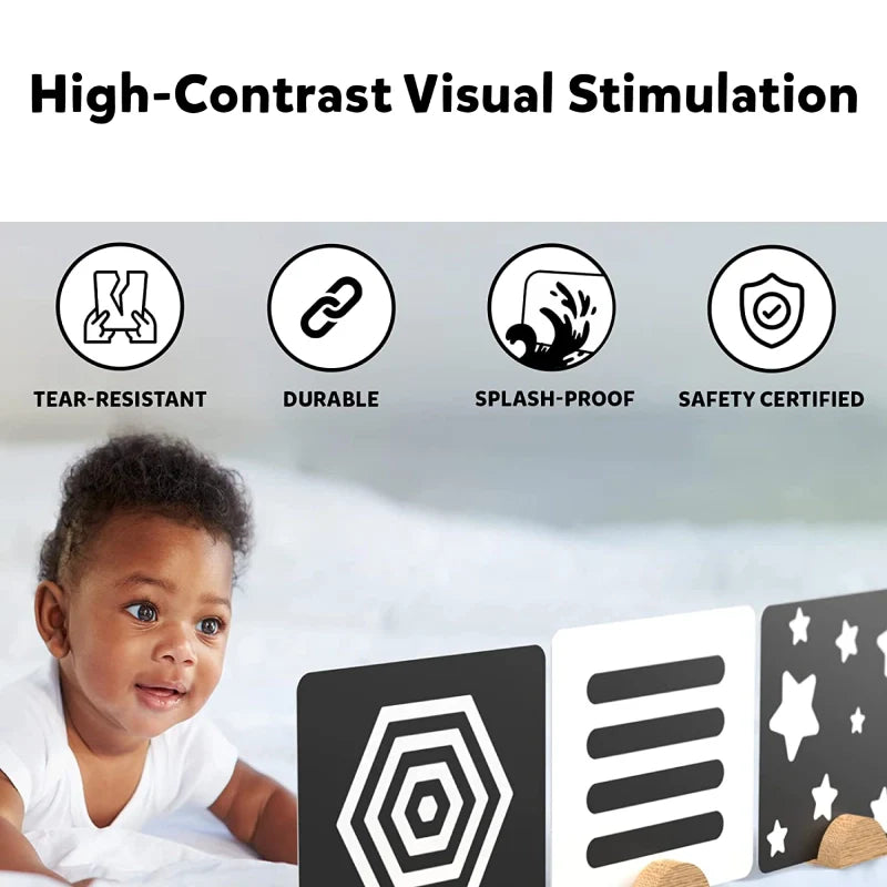 These flashcards, designed specifically for newborns and babies, have high-contrast colours and shapes that are known to grab your baby's attention and advance cognitive development. Be ready to witness your infant's world unfold as their eyes light up with excitement and wonder. The wooden stands that are included with the package let you place the flashcards anywhere at any time.
