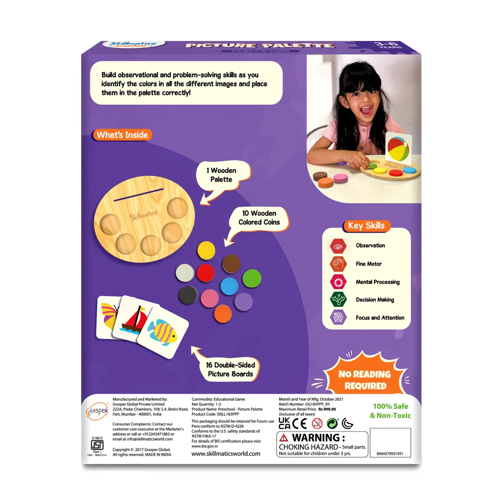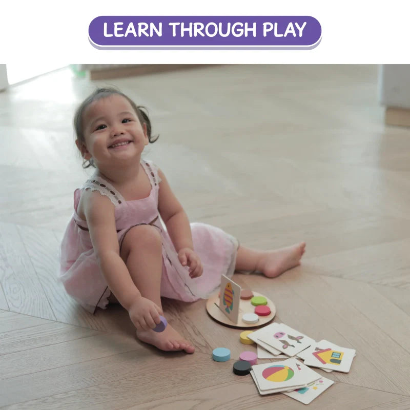 Place the wooden discs on the palette to match the colors in the images and build color recognition skills!