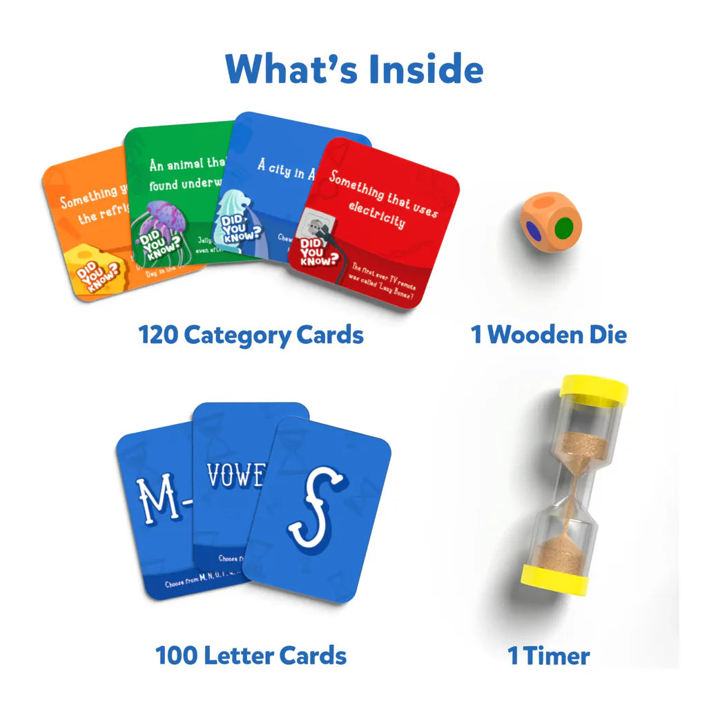 HOW TO PLAY : Roll the die, pick up a category card & get ready to rumble! Race with players to think of answers for the chosen category and get rid of as many letter cards as you can. The first one to get rid of all their letter cards wins the game!