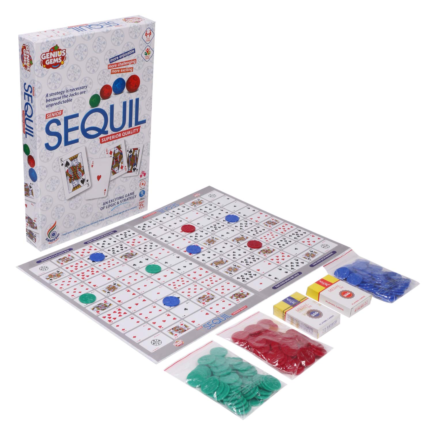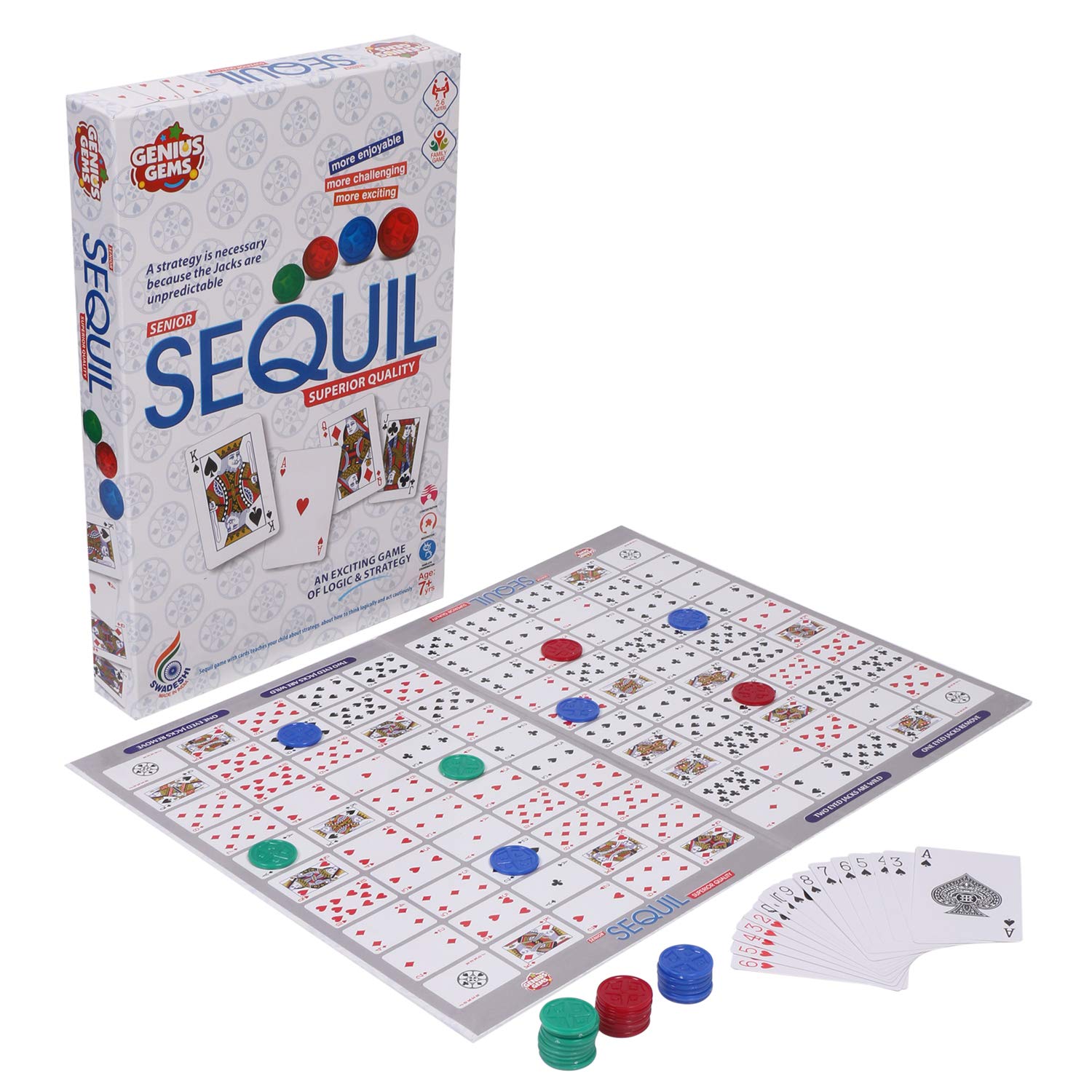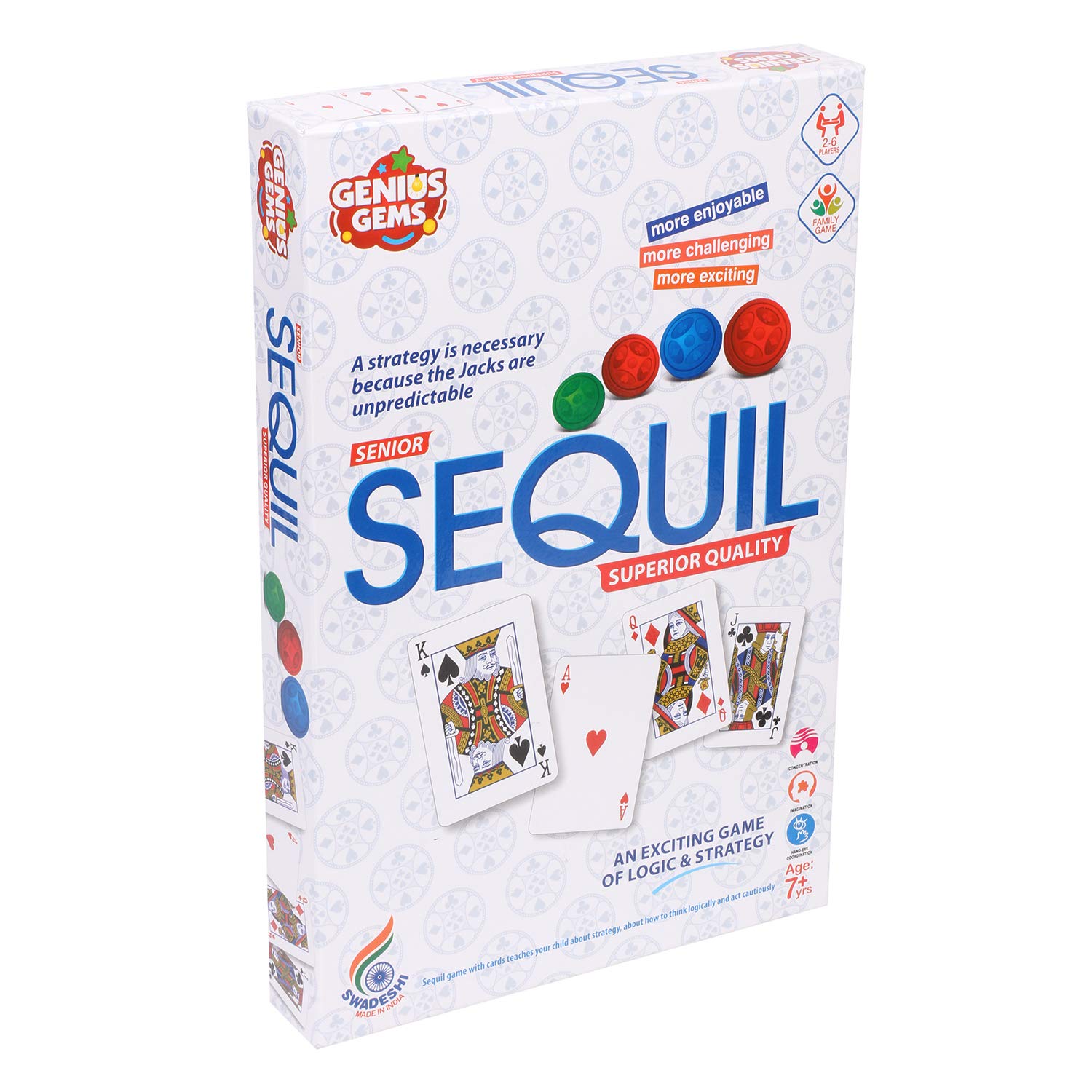 • This Sequil game with cards teaches your child about strategy, about how to think logically and act cautiously, how to think three steps ahead, and how to win or lose graciously. Using these skills, your child will grow into an adult who doesn't give in to impulse decisions but will approach their problems from every possible angle before making up their minds.