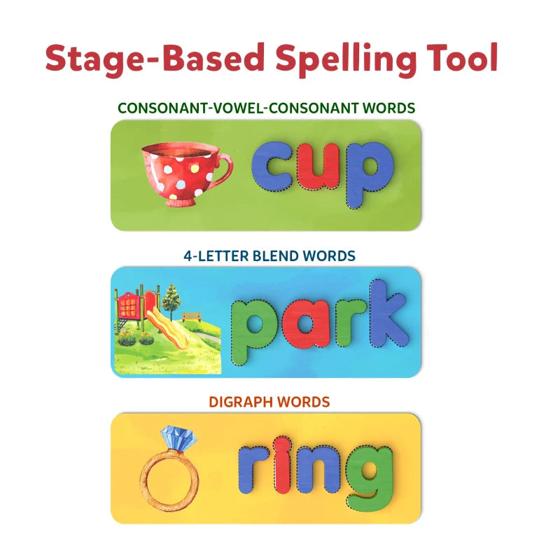 LEARNING TOY FOR AGES 4 TO 7 - Ready to Spell helps your child learn to spell, one step at a time! With colour-coded boards, your child will progressively learn to spell Consonant-Vowel-Consonant Words, 4-Letter Blend Words, and Digraph Words.