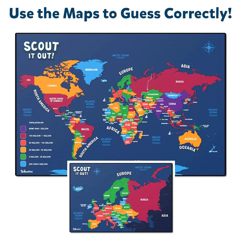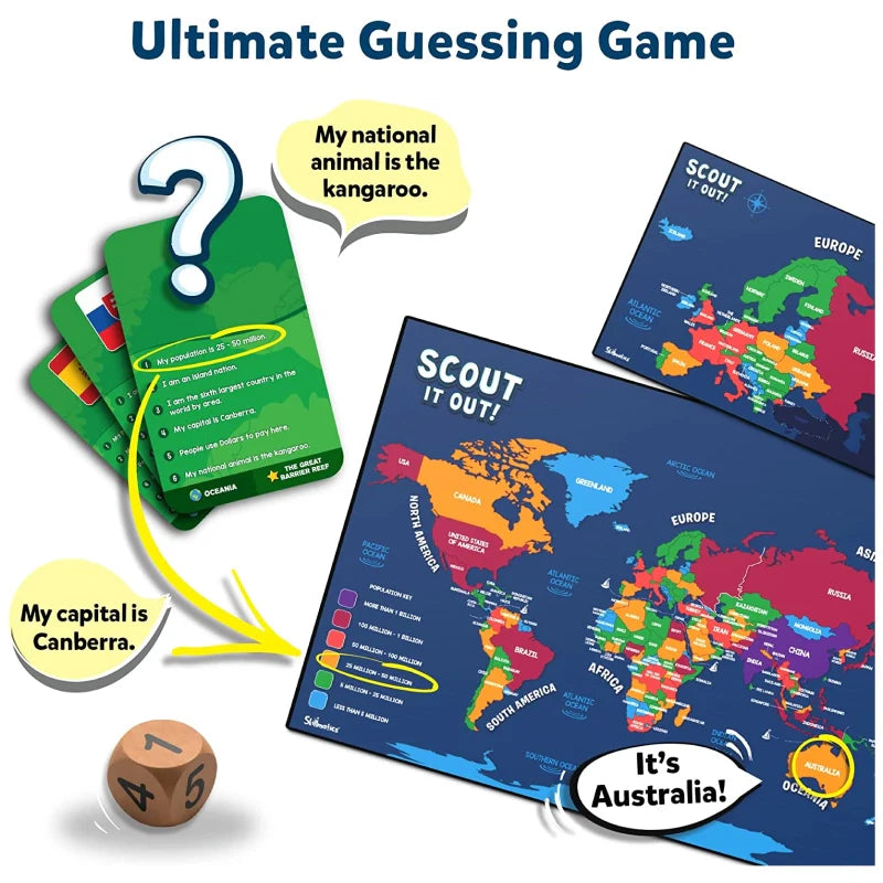 Scout it out - Countries is an educational board game that primarily focuses on the world map - geography. This game is highly resourceful because of the in-depth content around the world. This is a challenging trivia board game that takes you around the world as you guess and win. Explore the world, learn about countries and strategize carefully as you answer trivia questions