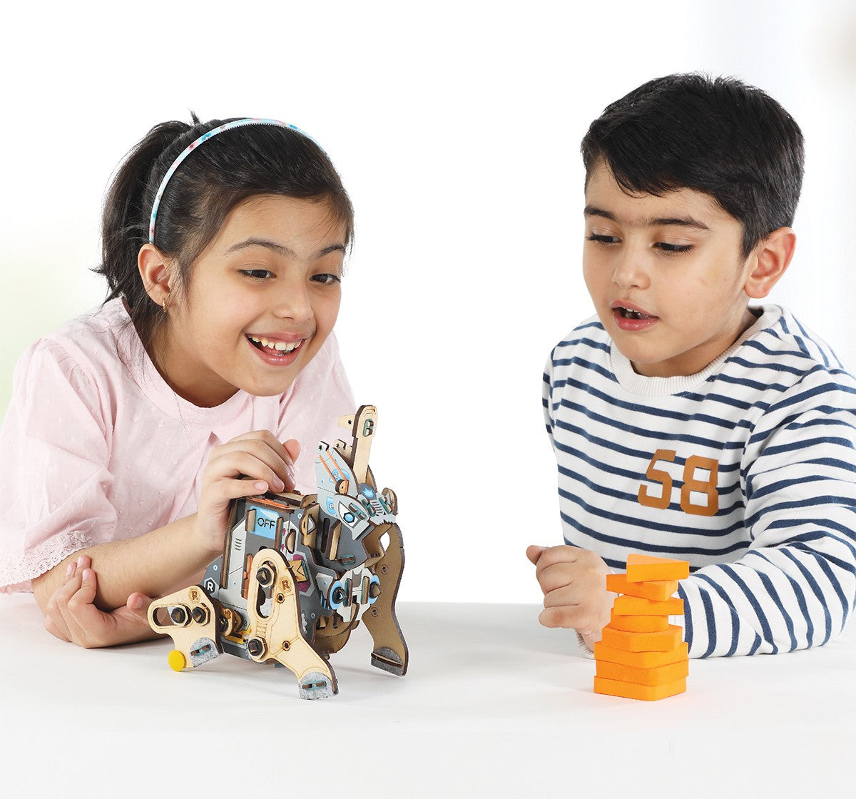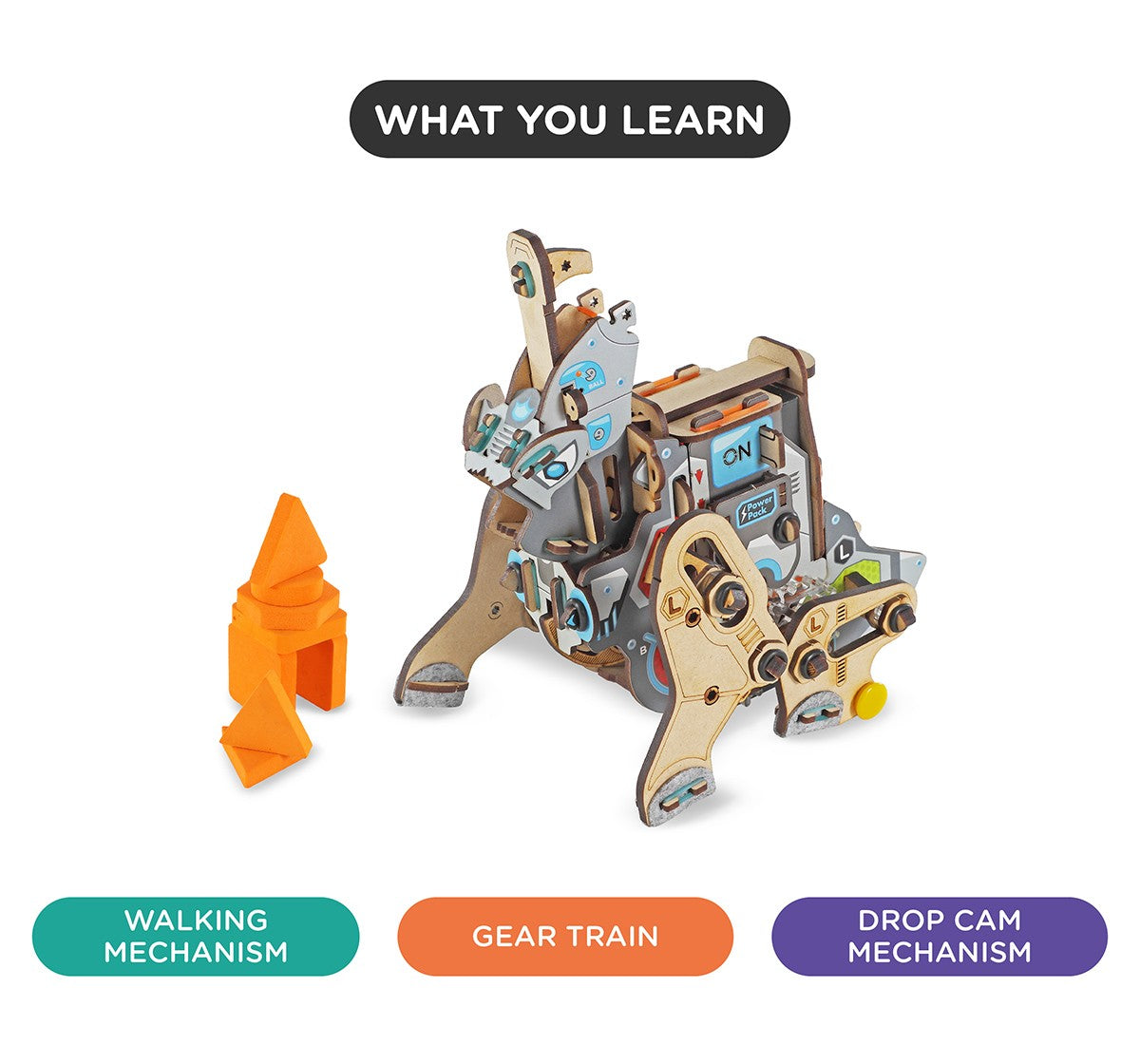 Whirr .CLICK! Thump .Whirr .Using the fun and clear instruction booklet, construct a 4-Legged Walking Robot - Wreck-It-Saurus.Arrange the obstacles, load the Bot with balls, switch the Bot ON and watch it wreck the obstacles.What's more! Rearrange it's legs to change your Bot's walking style. Make it skate, make it hop, make it walk in styles unseen.Using the Learn and Explore section, makers will tinker and explore the concepts of Gear-Train, various Walking Mechanisms of 4-legged creatures and the mechanics of Drop-Cam mechanism.