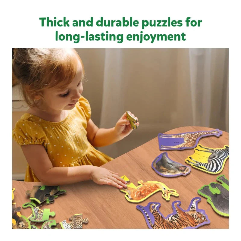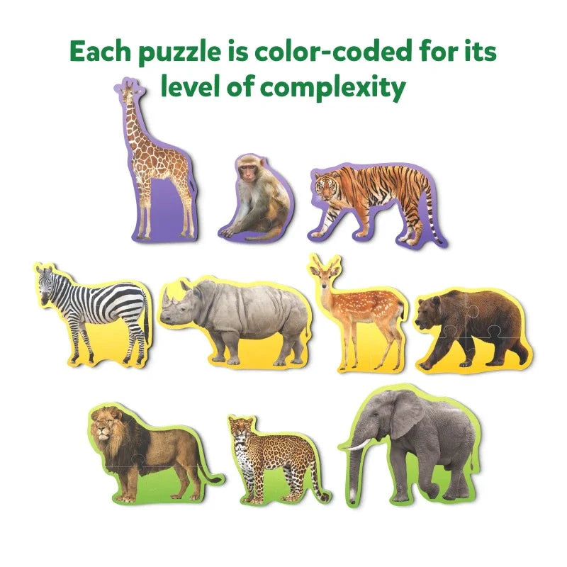 10 COLOUR-CODED PUZZLES - This set includes 10 colour-coded wild animal puzzles that progress in complexity. Start with the 3-piece puzzles and progressively work up to 4-piece and finally the 5-piece puzzles. Each typle of puzzle is color-coded so it's easy to sort. As young children master their puzzling skills, they'll learn about wild animals and build confidence along the way.