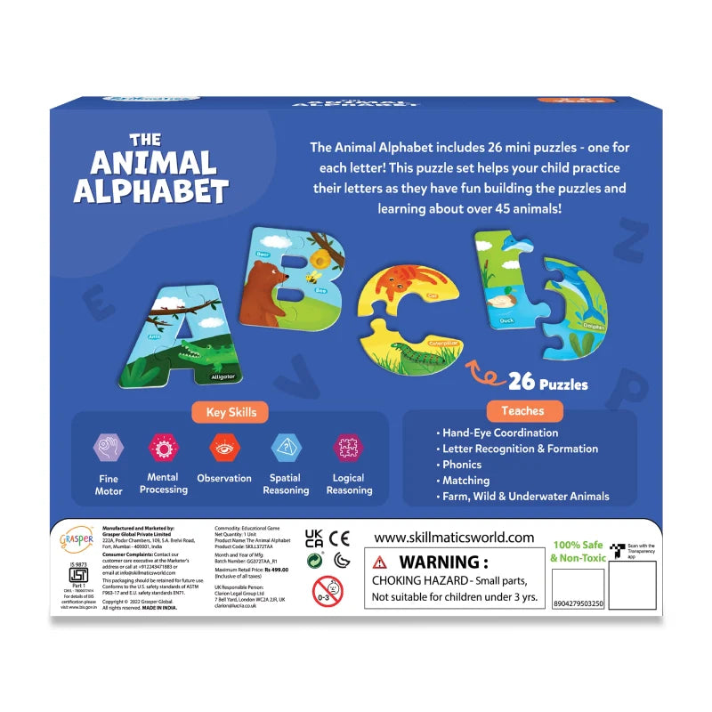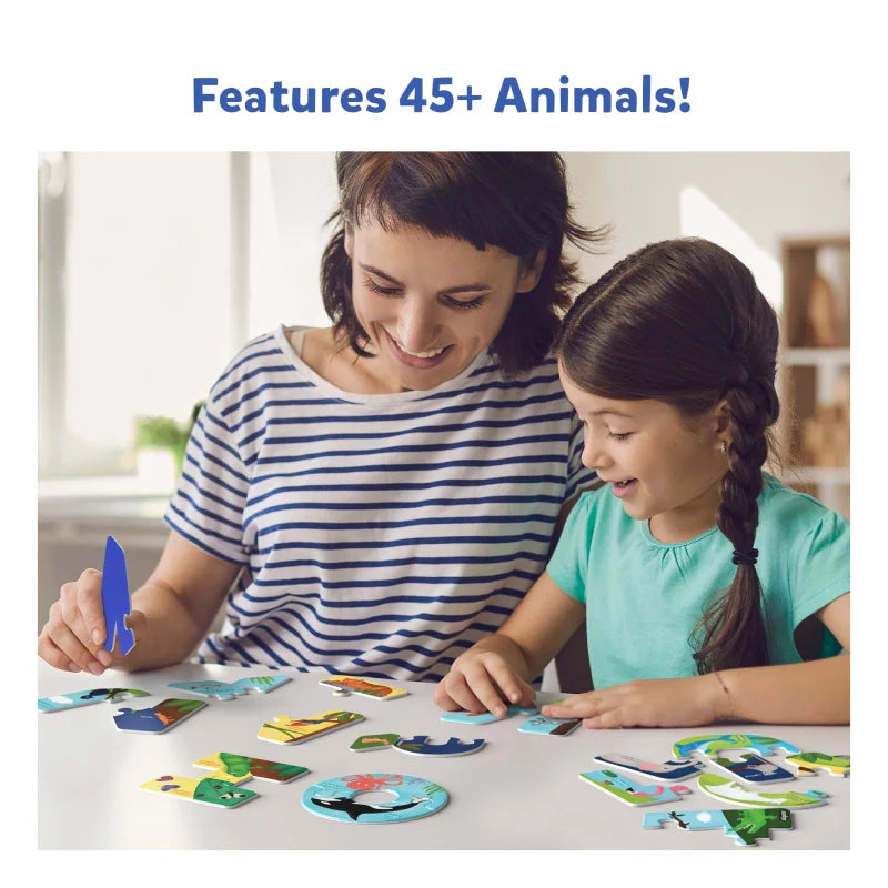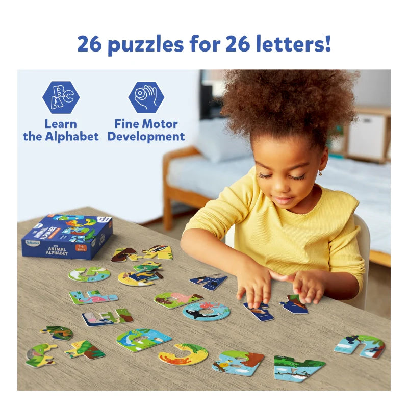 26 MINI PUZZLES FOR PRESCHOOLERS - The Animal Alphabet puzzle set includes 52 extra-thick cardboard pieces that are easy for children to put together. Once the puzzles are completed, they display 26 colorful uppercase letters that feature over 45 animals!