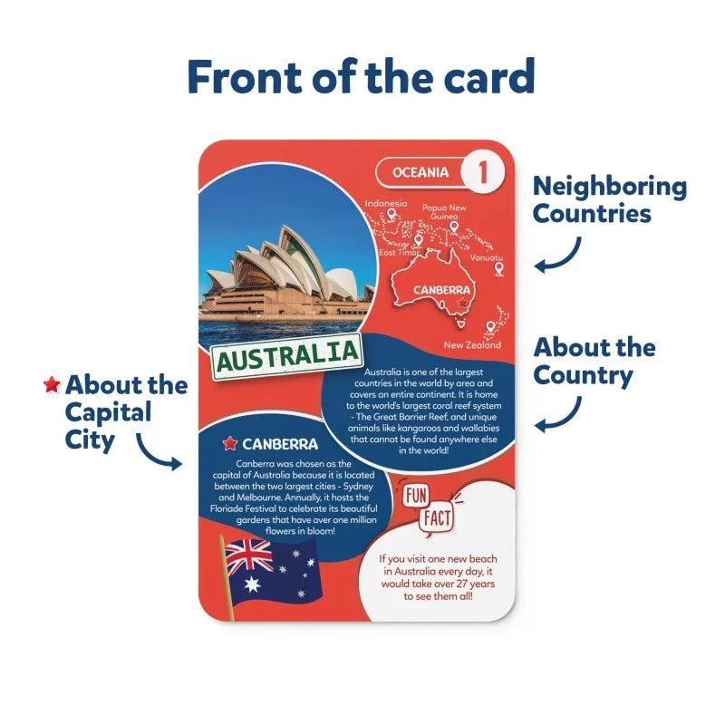 EDUCATIONAL WORLD MAP PUZZLE - Assemble our 96-piece world map puzzle and embark on an educational journey! With 100 country cards included, children can learn about the countries of the world, their capitals, and uncover over 400 fun facts!