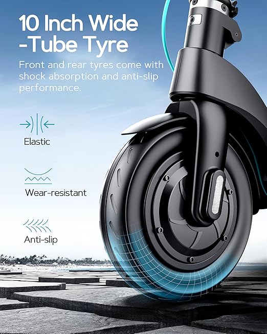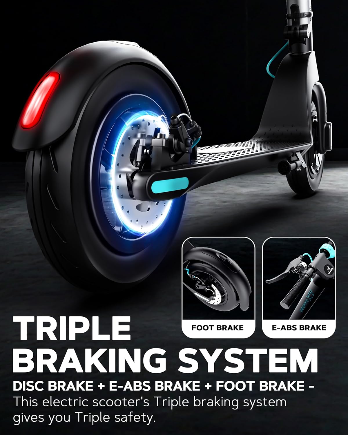 • 【Triple Braking System 】E-ABS Brake + DISC Brake +Pedal Brake - This electric scooter's Triple braking system gives you Triple safety. Front and rear tires Come with shock absorption and anti-slip performance.